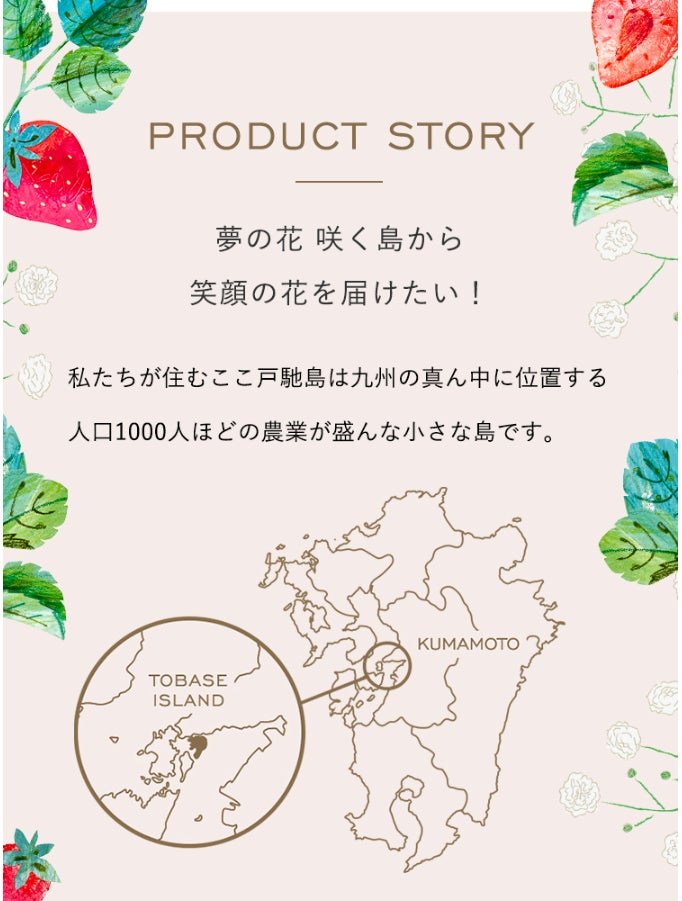 今回、新たに作った「美味しいイチゴの花束」は当園だけではなく、地元に30もあるいちご農家さんと、かすみ草農家さんの希望をぎゅっと詰めたプロジェクトで、この島のストーリーと共に全国の皆さんにお届けしたいと願っています。