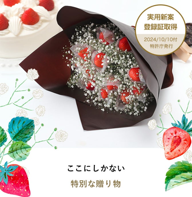 いちごとかすみ草を組み合わせる新商品として、実用新案登録証を取得しています。だから大切な人に届けたいオンリーワンギフトとして喜ばれます。(棒など刺さずに固定しているので日持ちもします)