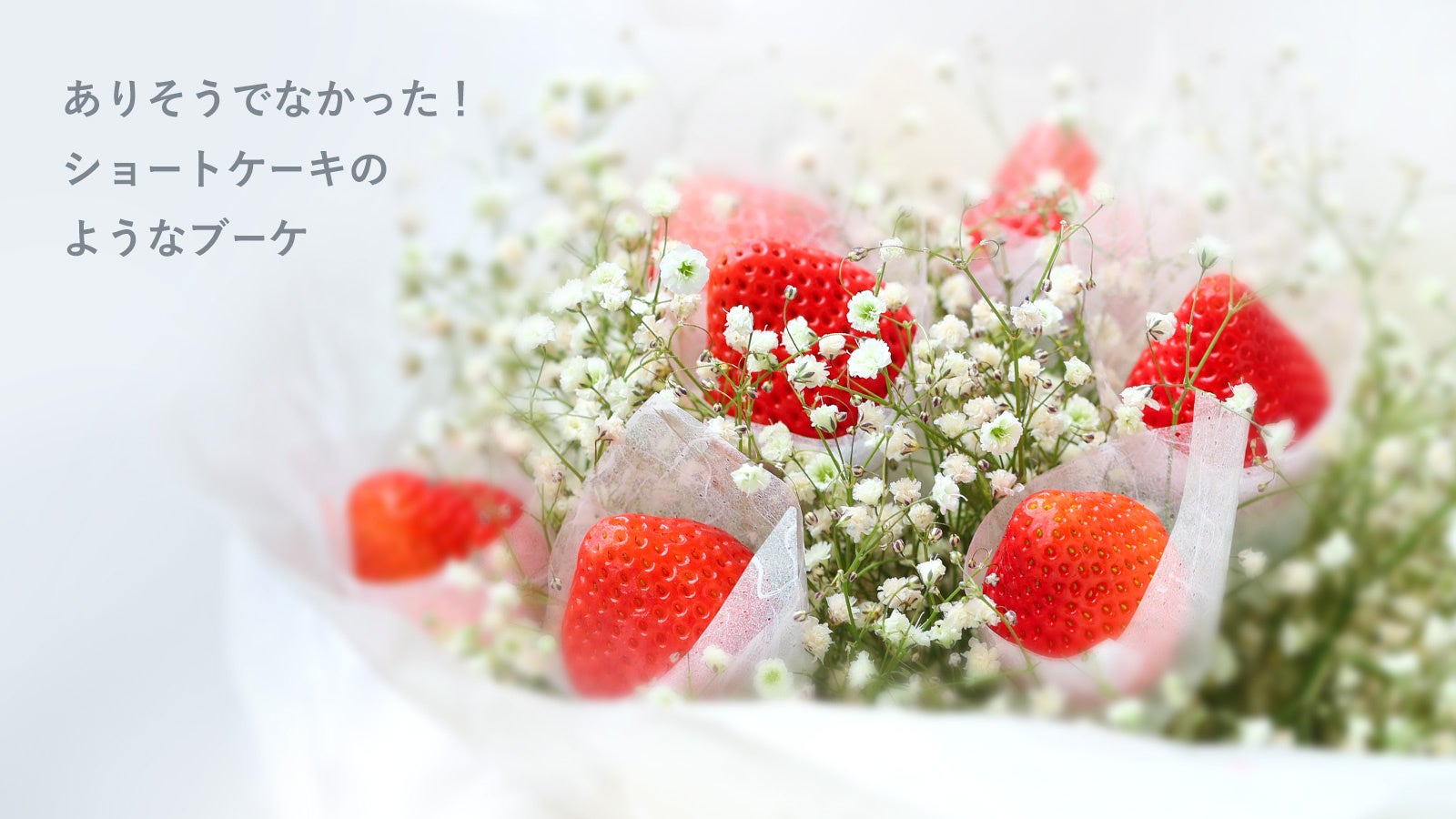 いちごとかすみ草を組み合わせた「いちごのブーケ」は、見た目の可愛らしさと甘い香りが特徴。実用新案取得(イチゴの固定方法と花の組み合わせ)のここだけ商品として、makuakeプロジェクト後は自社ECを中心に2月から販売を行う予定です。