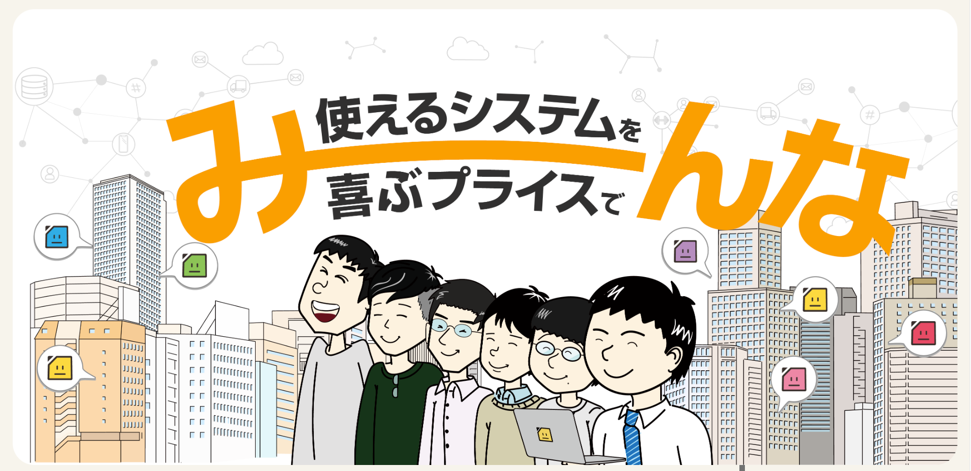 「みんなが使いやすいシステムを、みんなが喜ぶプライスで提供する」をモットーに、中小企業に特化したシステムの受託開発を行っています。