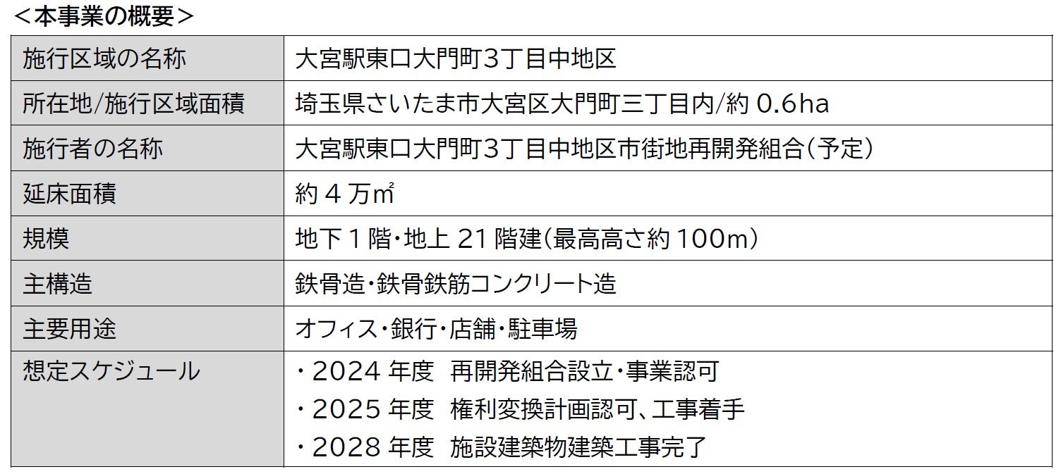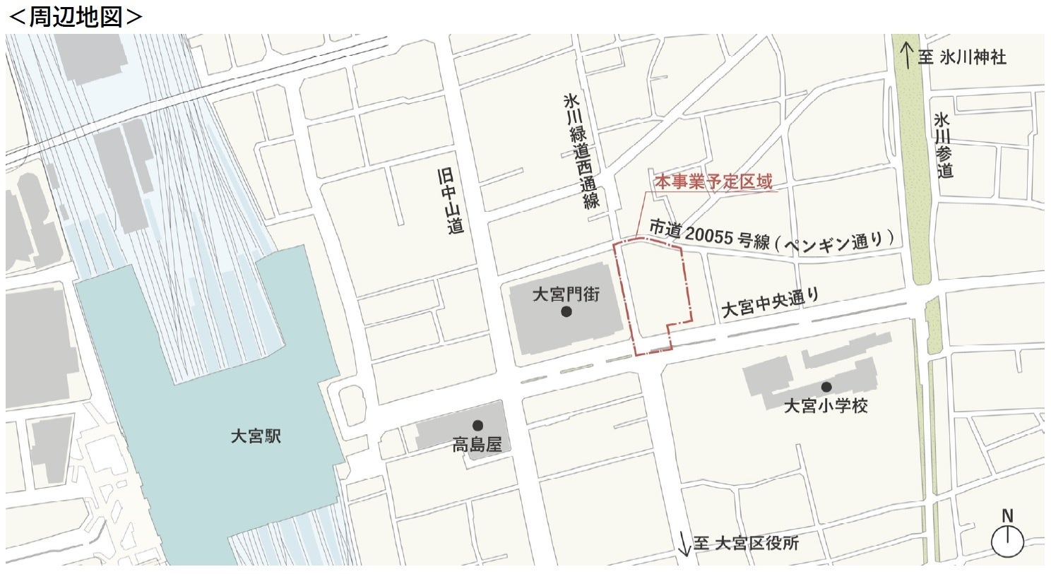本事業の計画地は、都市再生緊急整備地域(大宮駅周辺地域)内に立地するとともに、東日本の広域交通拠点である大宮駅東口周辺の商業・業務集積エリアと、氷川参道周辺の緑豊かな住宅エリアの結節点に位置しています。このような立地特性を踏まえ、新施設は高水準の環境・ウェルネス性能を備えたオフィスを中心に構成しながら、低層部には銀行・店舗と緑溢れるオープンスペースを設けることで、さいたま市が推進する「グリーンインフラの形成」や「ウォーカブルなまちづくり」に貢献するとともに、オフィスワーカー/地域住民の方々へ、新たなワーク/ライフスタイルを提供することを企図しています。