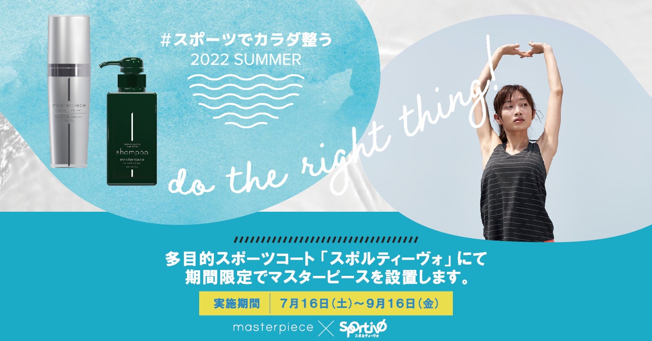 スカルプケアブランド「マスターピース(master piece)」を手がけるSAKURA物産株式会社(本社:東京都中央区)は、多目的スポーツコート「スポルティーヴォ(Sportivo)」の運営を手がける株式会社フロムワン(本社:東京都中央区)とタイアップし、7月16日(土)より期間限定で、スポルティーヴォの7店舗のシャワールームにシャンプー及びヘアケアミストを設置いたします。