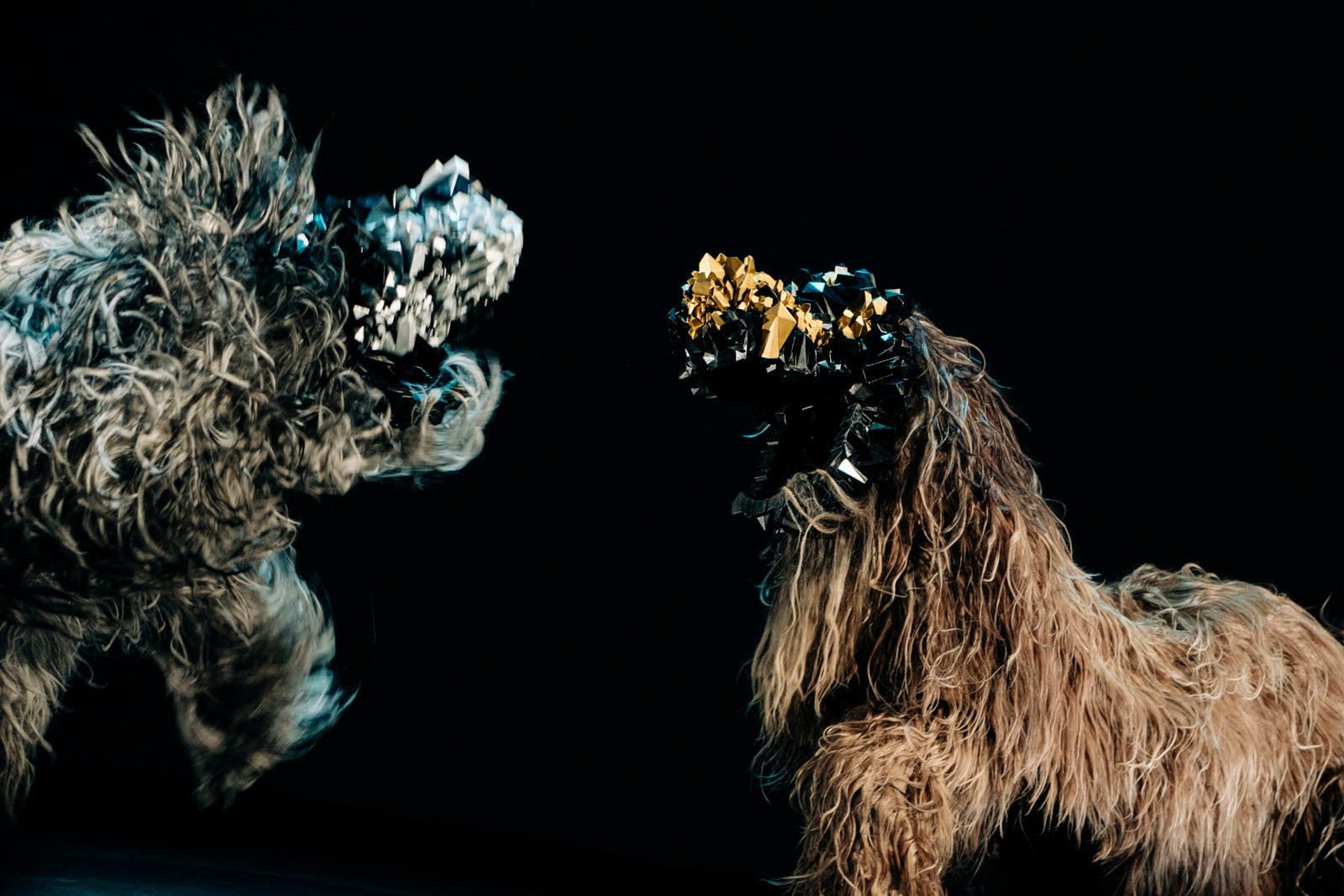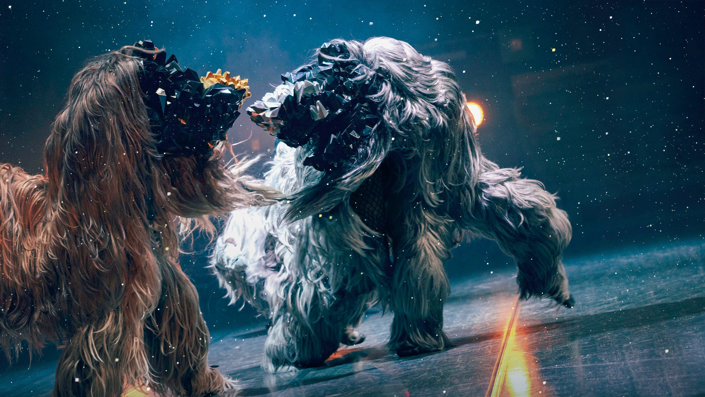 金と銀の2頭の獅子は、さまざまな人々の手によって製作されています。「結晶」をモチーフにした3Dモデリングによる緻密なデザインは、3Dプリンティングによる成形技術が実現を可能にしました。そして「眼がない」現代獅子に生命をふきこむのは、沖縄で活躍する創作エイサーグループの舞手たち。日本各地につたわる獅子舞の動きを研究して、愛くるしくも激しいひとつの生命が宿る演舞を生み出しました。作中のタップダンスと金と銀の獅子のセッションは圧巻です。