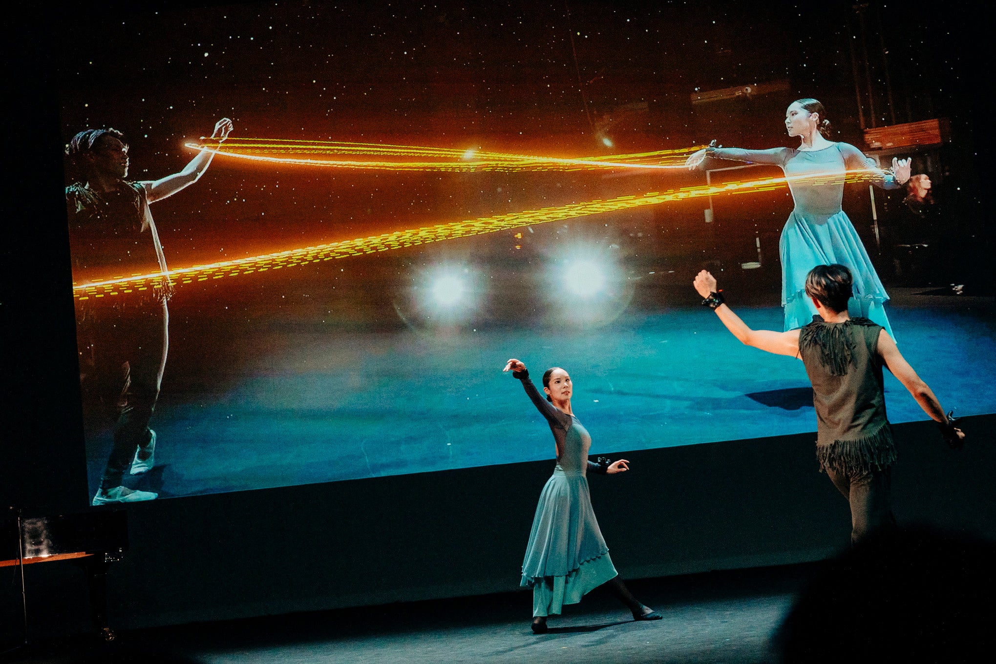 全編を彩るXR(クロスリアリティ)合成システムは、本作のためにオリジナルで制作されました。舞台手前に陣取るPCには、舞台と同じ広さの仮想空間が作成してあり、そのなかでは、ダンサーやカメラマンの動きがリアルタイムに再現されています。仮想空間では演者の動きに反応するCGが描画されて、観客は舞台上をうごくカメラの視点をとおして、AR合成された映像を観覧します。人類の叡智がつまった身体表現であるバレエの美しさと、テクノロジーの正確さが他に類を見ない調和を生み、作品表現の情景を深めています。