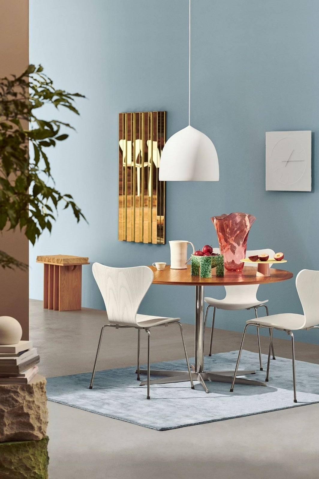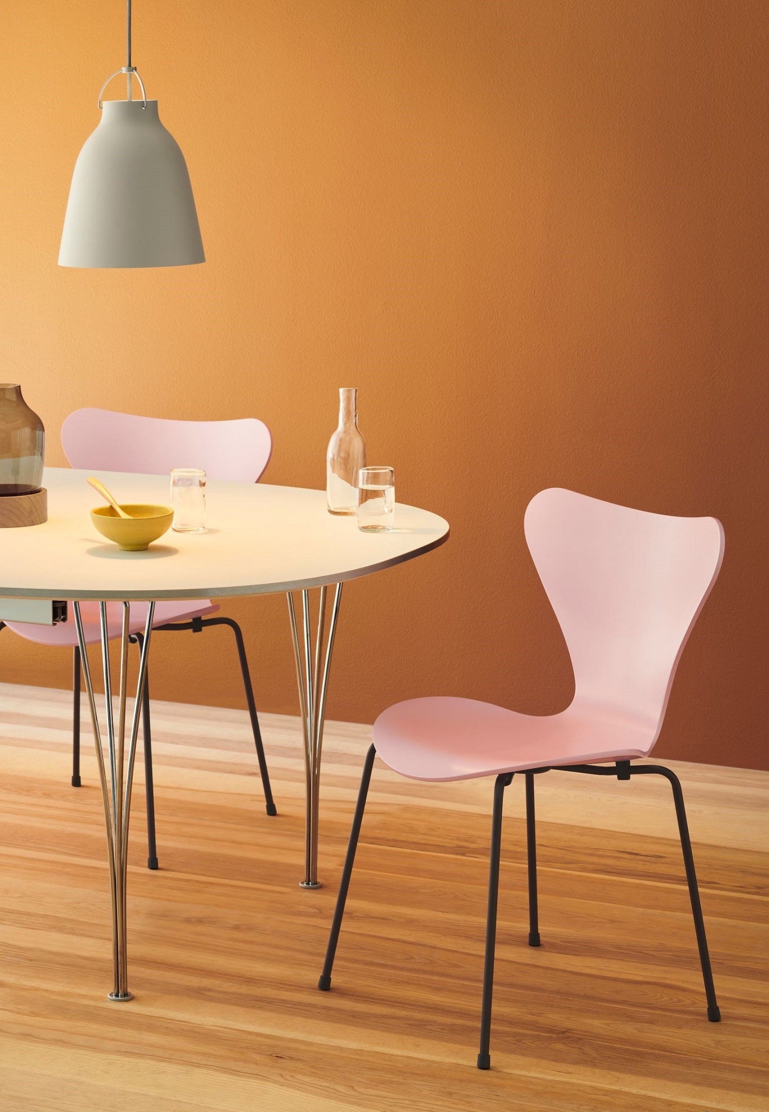 曲線的なシェルのシルエットを際立たせる、華奢でありながらも丈夫なスチールパイプ製のベースが特徴的なセブンチェアの3107モデルは、ベースはシートの外側に向けて少し広がっているため、簡単に一列に並べたり、スタッキングしたりすることができます。目立たないようにとシート下のディスクにマウントされたベースがヤコブセンデザインのクリーンでミニマルな美学を一層引き立てます。