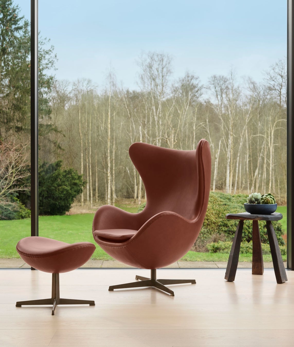 当店では、創立150周年アニバーサリーモデルのエッグチェアを展示しております。最上級の革を使用したグレースレザー仕様です。カラーは深みのある上品な栗色(チェスナット)。この記念すべき150周年の節目にふさわしいモデルをぜひ、目で見て感じ、お掛け心地をご体感ください。
