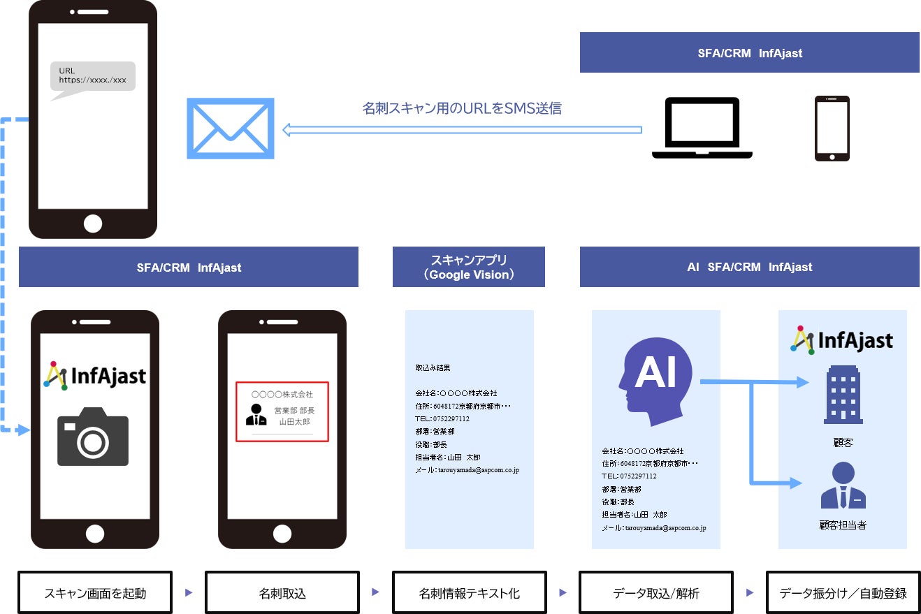 その他、「InfAjast」が今後提供を予定しているAI機能において、名刺からの自動登録にもSMSが活用されます。