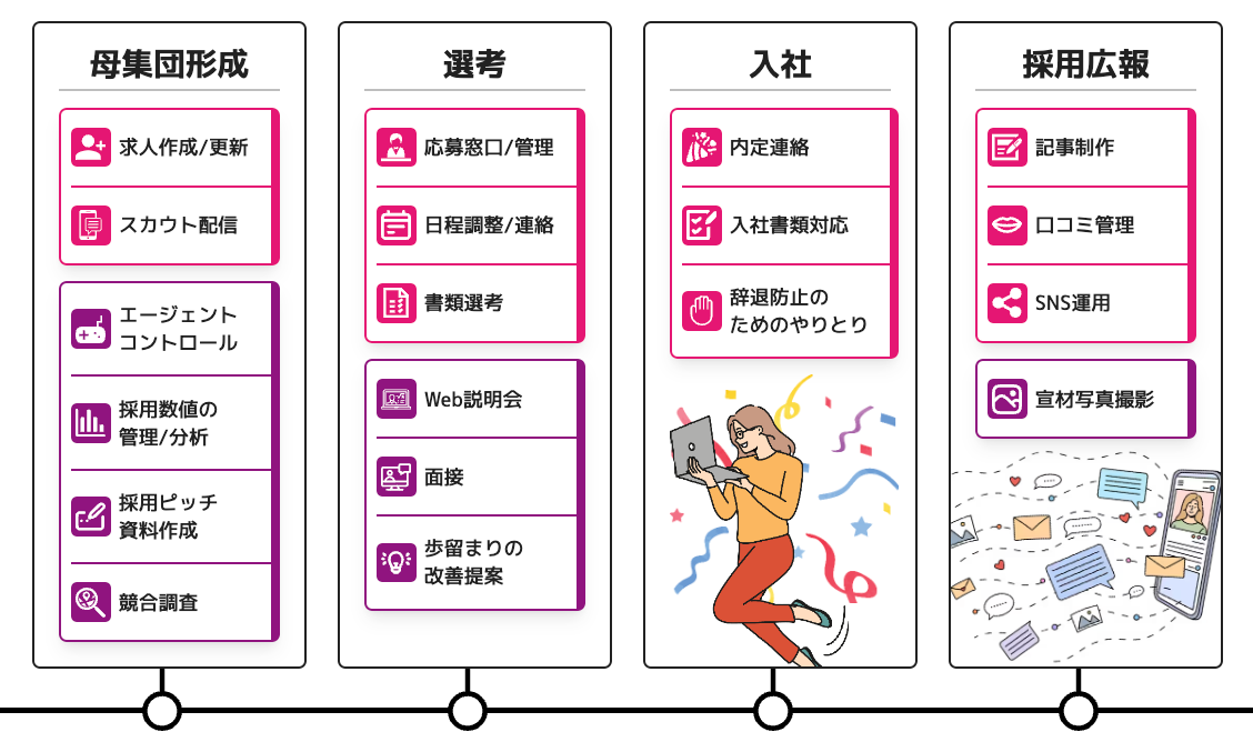 スカウト対象者のリストアップと送信、応募者への連絡やりとり、面接担当者との日程調整、合否結果の確認と連絡、エージェントとのコミュニケーションなど、日々の業務で時間を取られがちな、人によってパフォーマンスがあまり変わらない実務=ノンコア業務に特化したご支援をおこなっております。