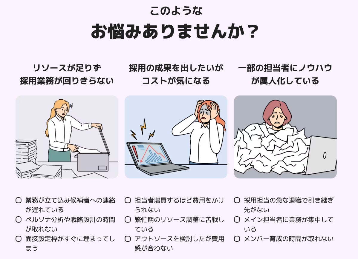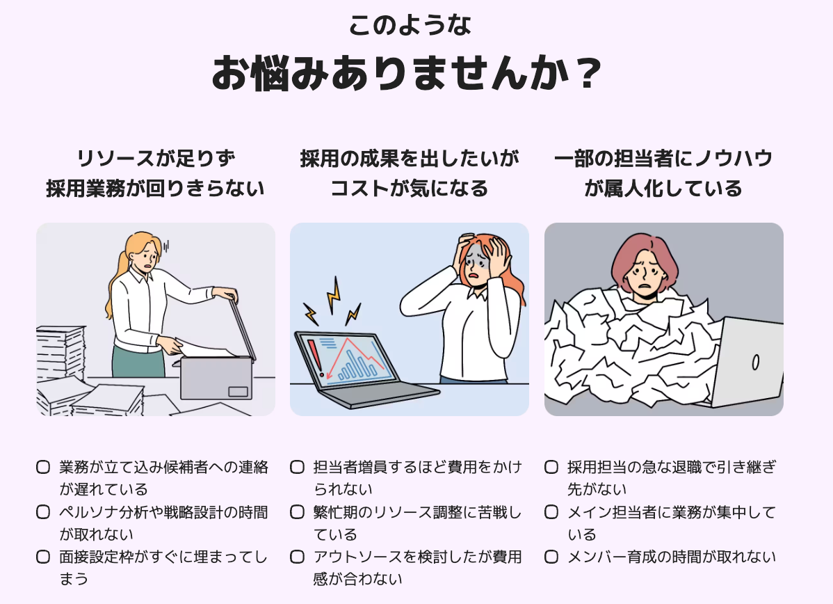 そうした状況において、私たちが持つ採用実務のノウハウをご提供することで、企業様に採用コア業務に集中いただき、採用に関する課題を解決できるのではないかと考え、低コスト・低リスクでご利用いただける、採用実務に特化したアシスタント・RPOサービスをローンチするに至りました。