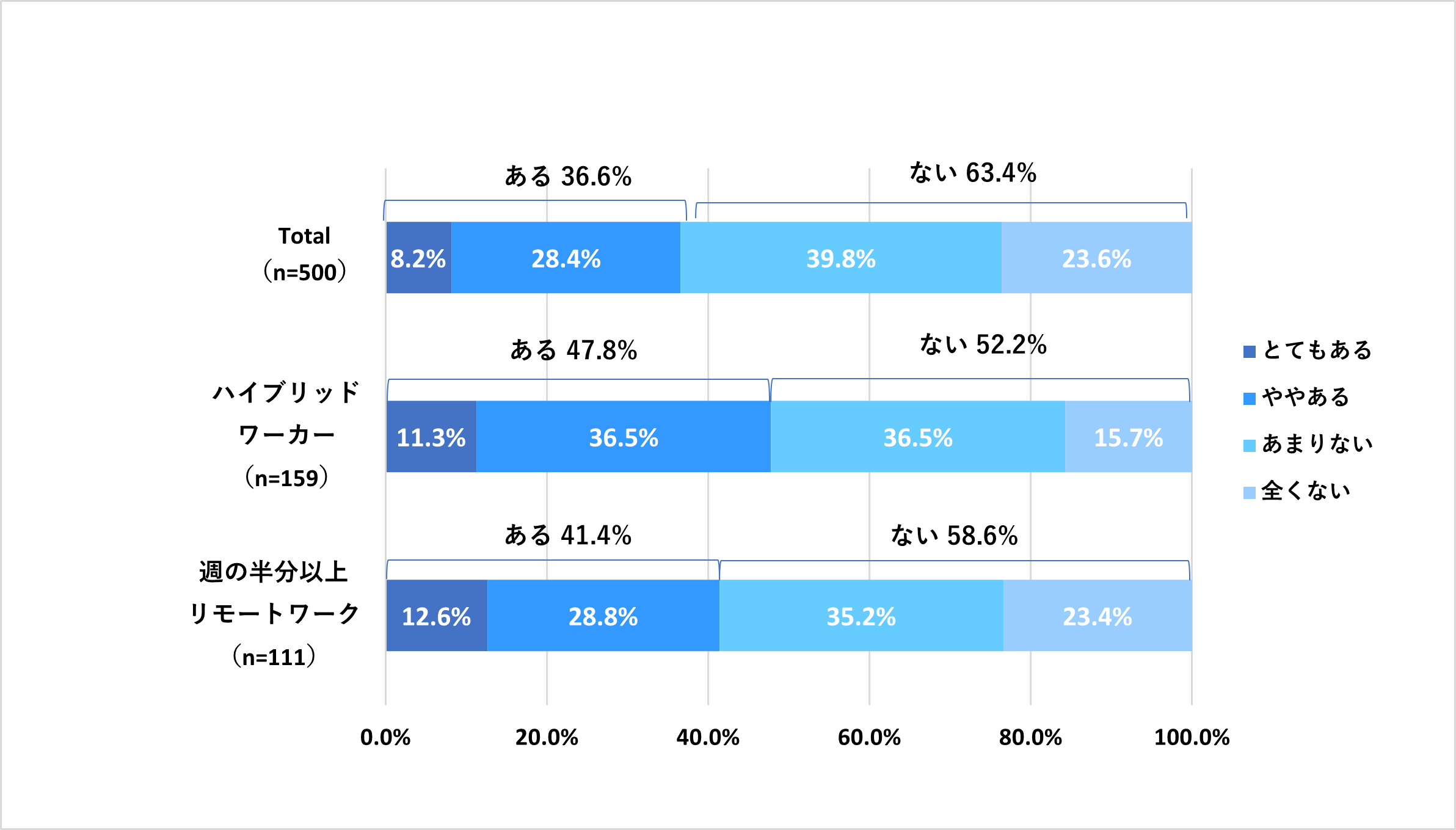 お勤め先の同僚や上司、部下などとのコミュニケーション(仕事上のやり取り・雑談など含む)で悩んでいることがあるか、という質問に対し、「ある」と答えた人は全体の36.6%という結果になりました。中でもハイブリッドワーカーにおいては約2人に1人(47.8%)が課題を感じており、週の半分以上テレワークを行っている人においては41.4%が課題に感じていると回答しました。
