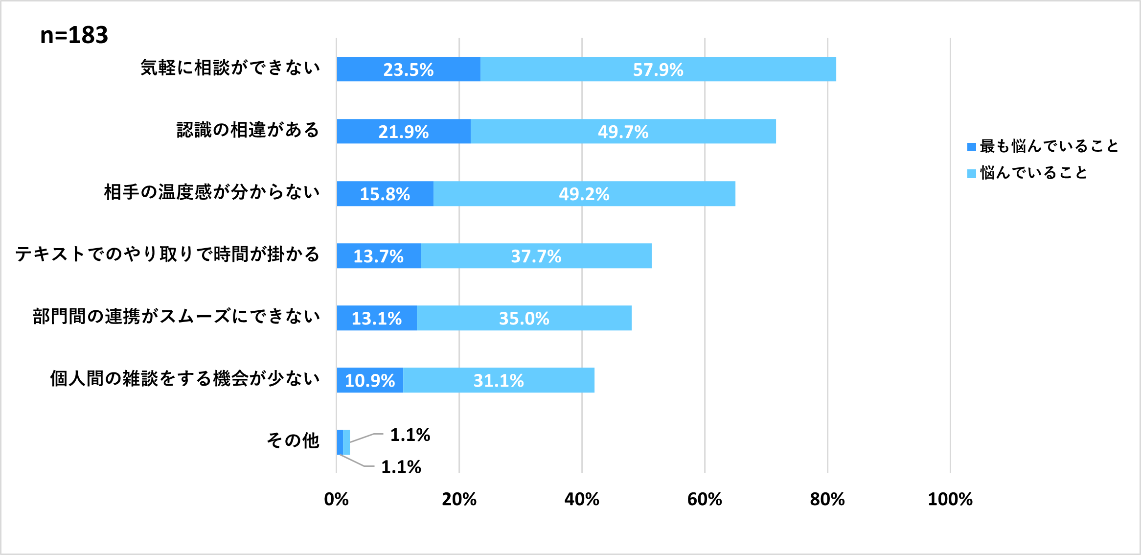 また、「個人間の雑談をする機会が少ない」という悩みにおいて、一般社員では21.1%である一方、管理職では42.0%と約2倍多い結果になり、上司と部下間にも同じ悩みで差があることが判明しました。