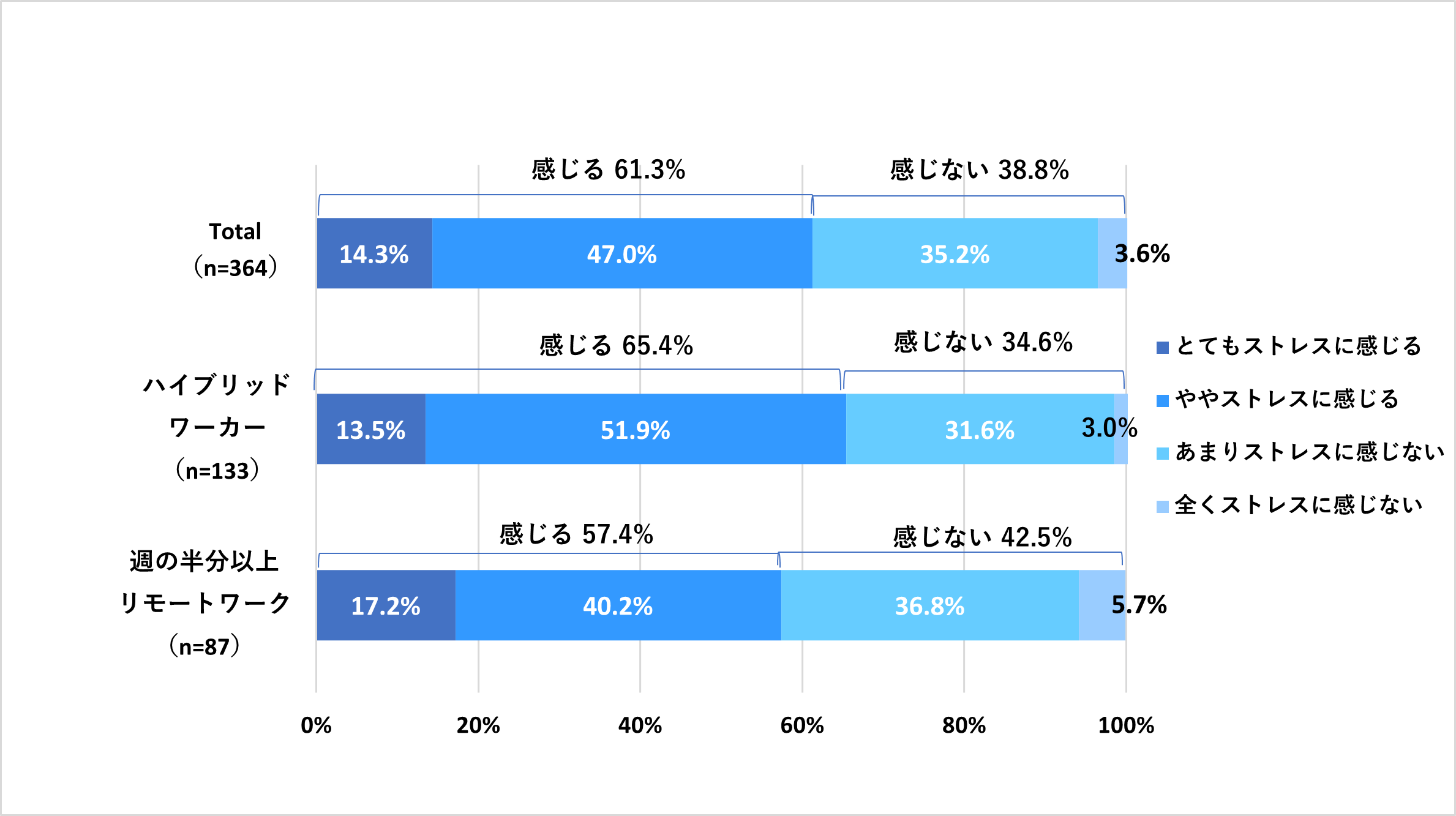 「待ちロス」を経験した364人のうち61.3%が「待ちロス」をストレスに感じていることも分かりました。特にハイブリッドワークスタイルをとっている人は、ストレスに感じている割合が高く65.4%であると判明しました。