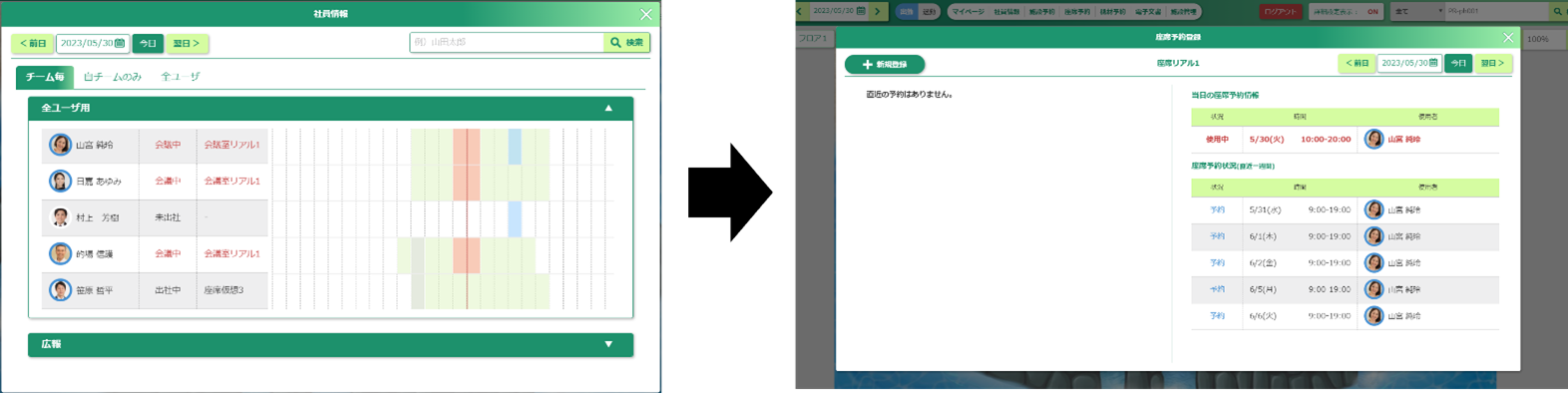 ▲リアルワーク・リモートワーク問わず社員が相互に勤務状況を確認でき、その情報を元にオンライン上での伝言メモやボイスチャット、Web会議を実施可能。