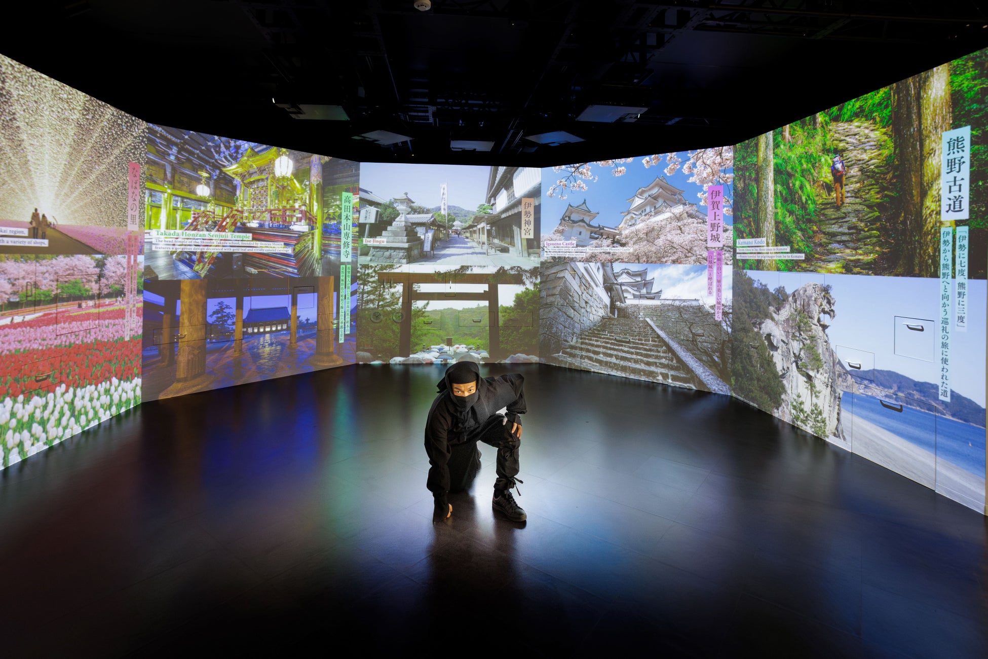トンネルを抜けて進むと大型5面スクリーンが登場。三重県5エリア(北勢、伊賀、中南勢、伊勢志摩、東紀州)それぞれが持つ自然、観光、文化、祭り、食の魅力を映し出します。