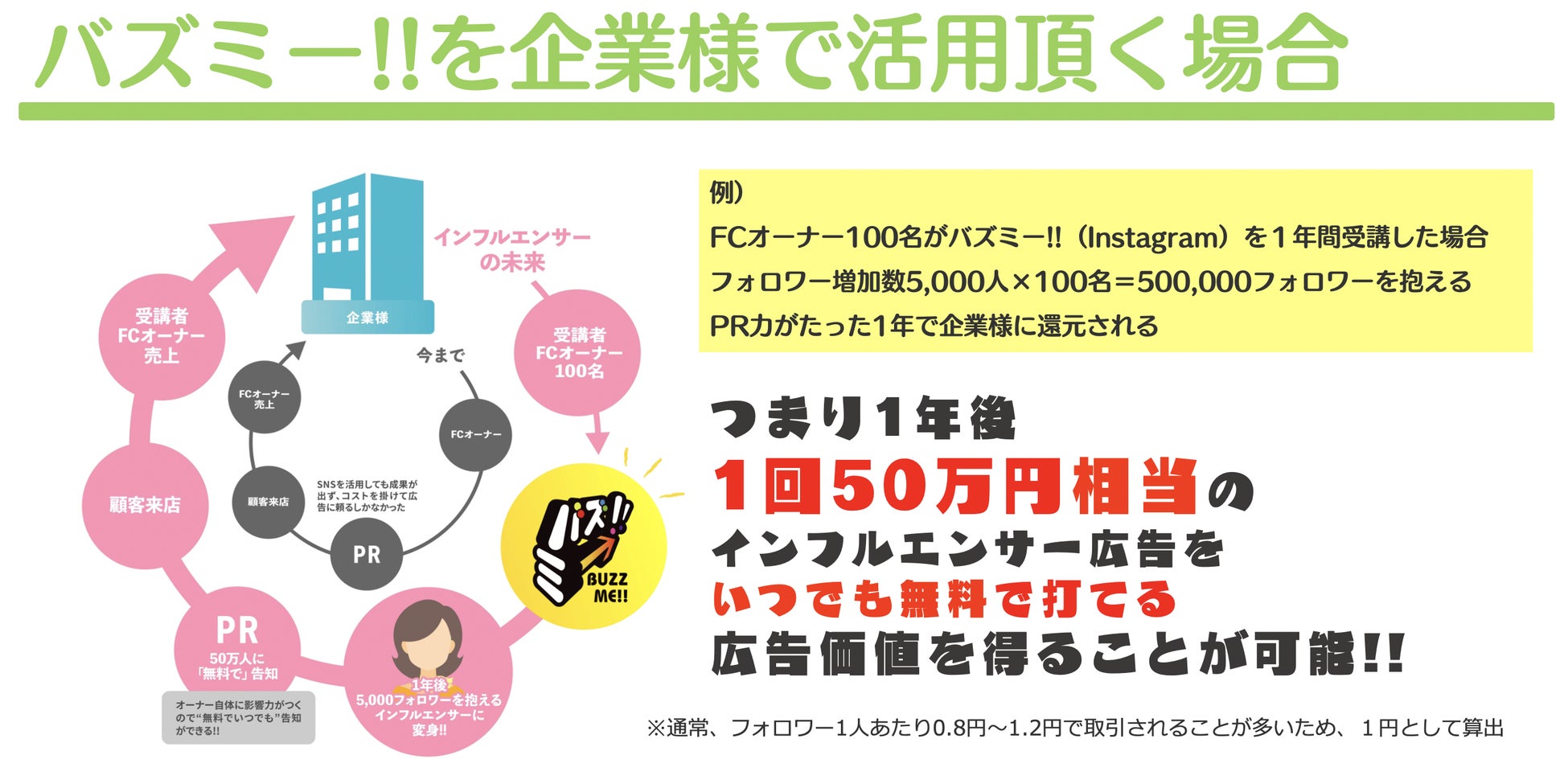 しかし、一人一人に向けた個別のコンサルティングでは、インフルエンサーを求める今の時代のスピードに到底追いつけないため、弊社で培ったInstagramノウハウを余すことなく提供できる動画配信サービス「バズミー!!」にて、企業様、その中で働くメンバー様たち一人一人を輝かせるインフルエンサー育成サポートに寄与していきたいと考えています。また今後はInstagram以外のSNSコースも随時追加を行う予定です。