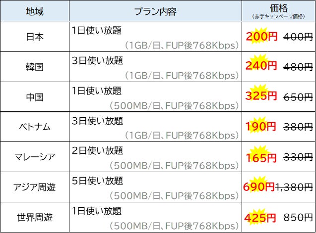 期間中は、すべての地域・すべてのプランが半額で「いつでも」「どこでも」「なんどでも」ご購入可能。購入済みデータは開通手続き前であれば1年間有効のため、事前購入も安心して行えます。特別な機会にお試しください♪(本キャンペーンは予告なく終了する可能性がございます)