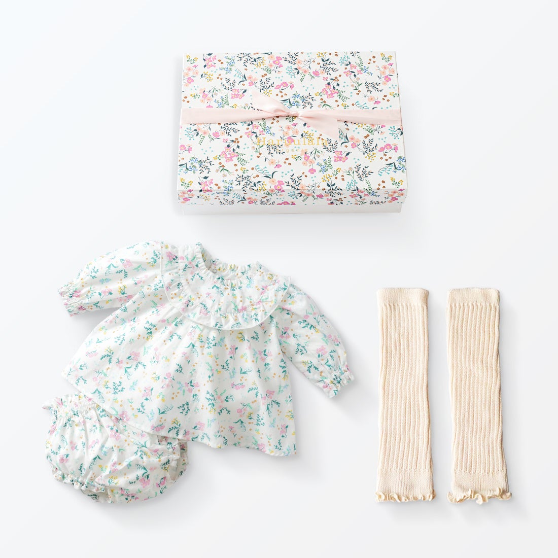 お洋服とお揃いのオリジナルギフトボックスをオプションでご用意。出産祝いなどの特別なギフトにぴったりです。丈夫な貼箱なので、母子手帳や写真を保管するメモリアルボックスとしてもお使いいただけます。