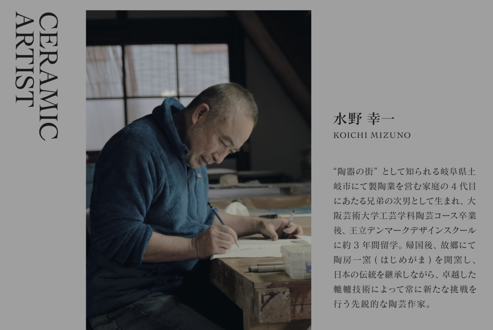 シリーズを監修したのは作家・水野幸一氏。“陶器の街”として知られる岐阜県土岐市にて製陶業を営む家庭の4代目にあたる兄弟の次男として生まれ、大阪芸術大学工芸学科陶芸コース卒業後、王立デンマークデザインスクールに約3年間留学。帰国後、故郷にて陶房一窯(はじめがま)を開窯し、日本の伝統を継承しながら、卓越した轆轤技術によって常に新たな挑戦を行う先鋭的な陶芸作家です。