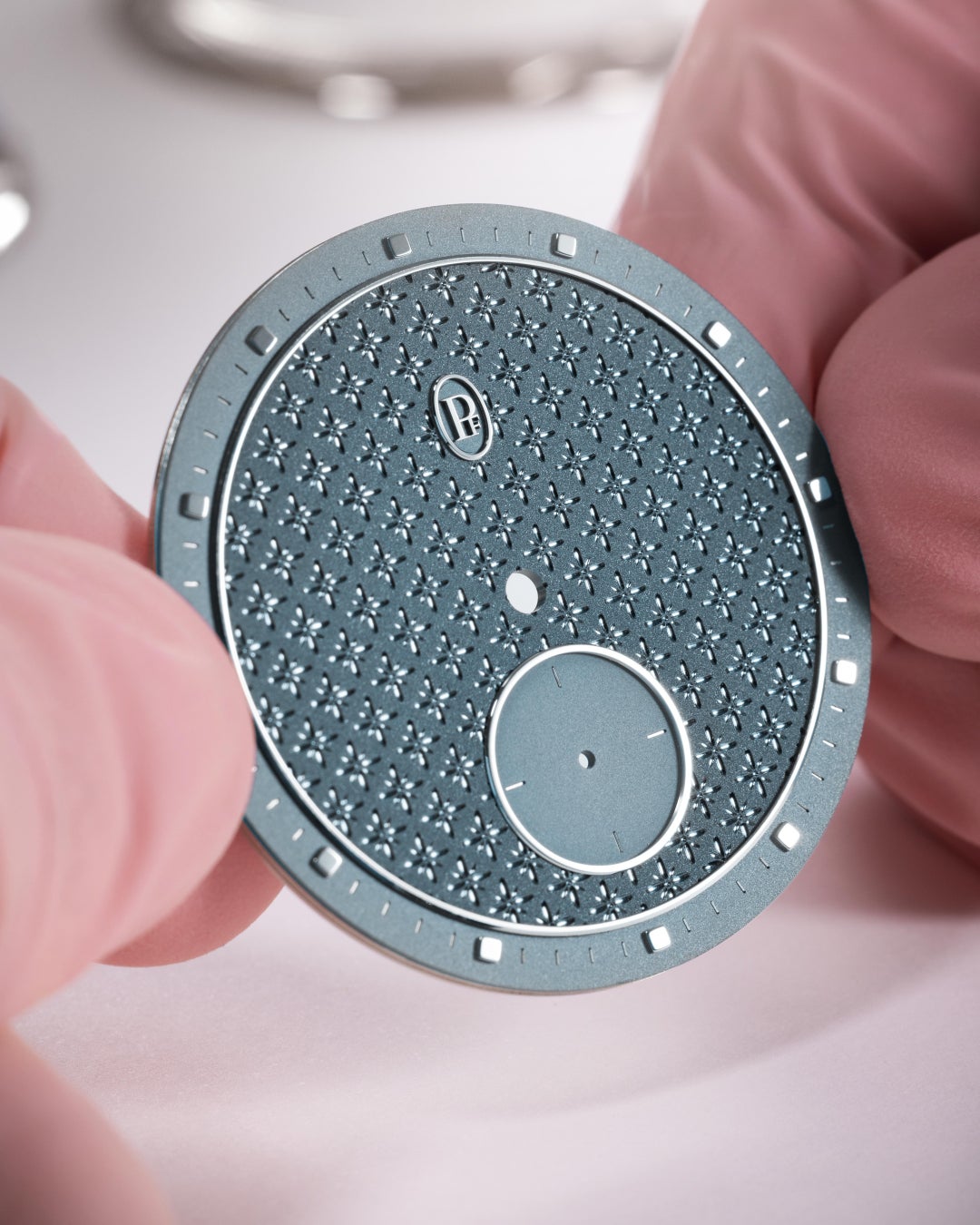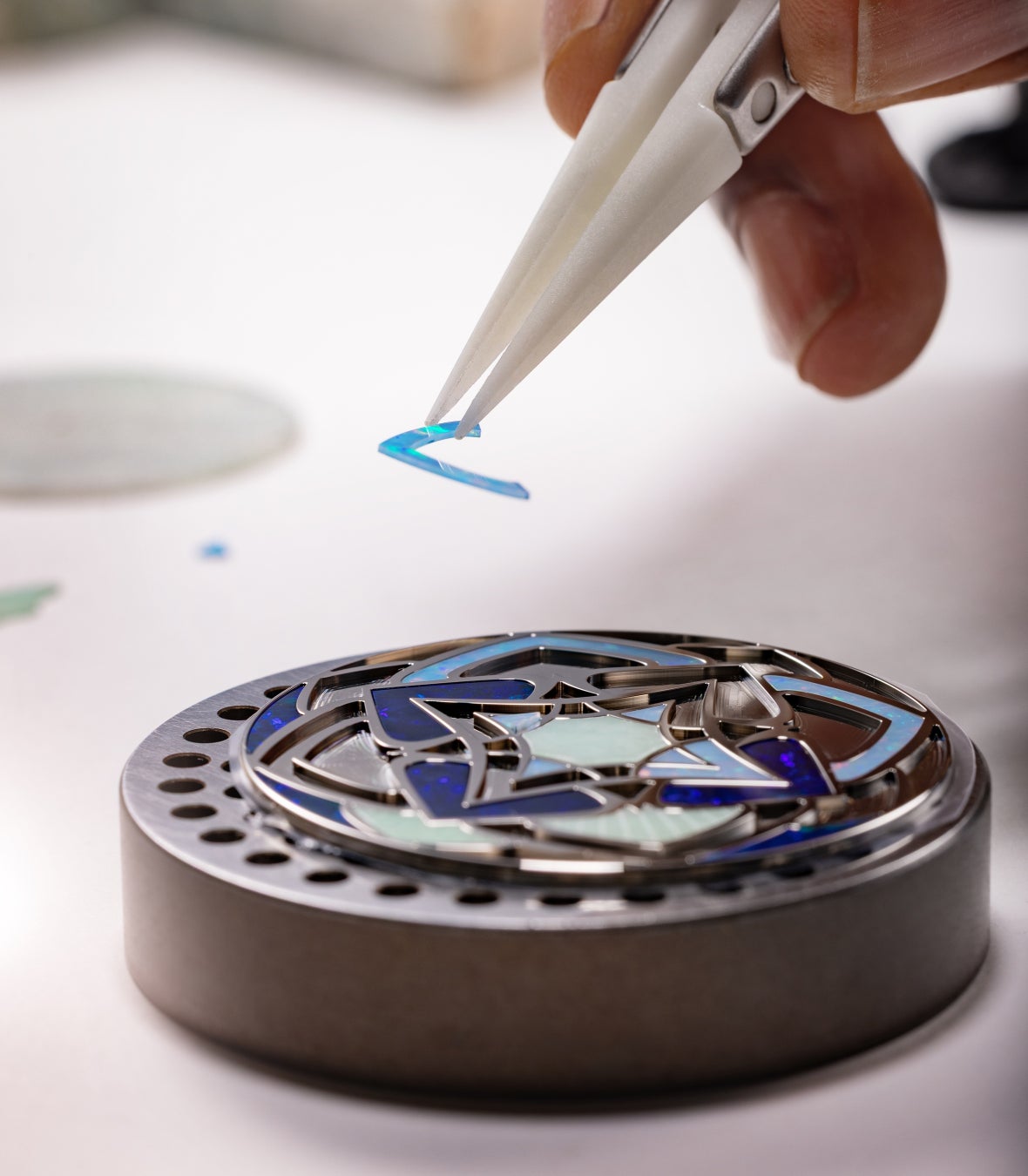 ミシェル・パルミジャーニにとって、このような自然界のフォルムは、根底に流れる秩序を明らかにするものです。この精神は、ケース、ダイヤル、ブリッジに生命を吹き込むエングレービング、そしてケースバックを飾るオパールと翡翠のマルケトリーに活きています。それは、きらめきと静寂、天空と大地の対比を調和させる構図です。