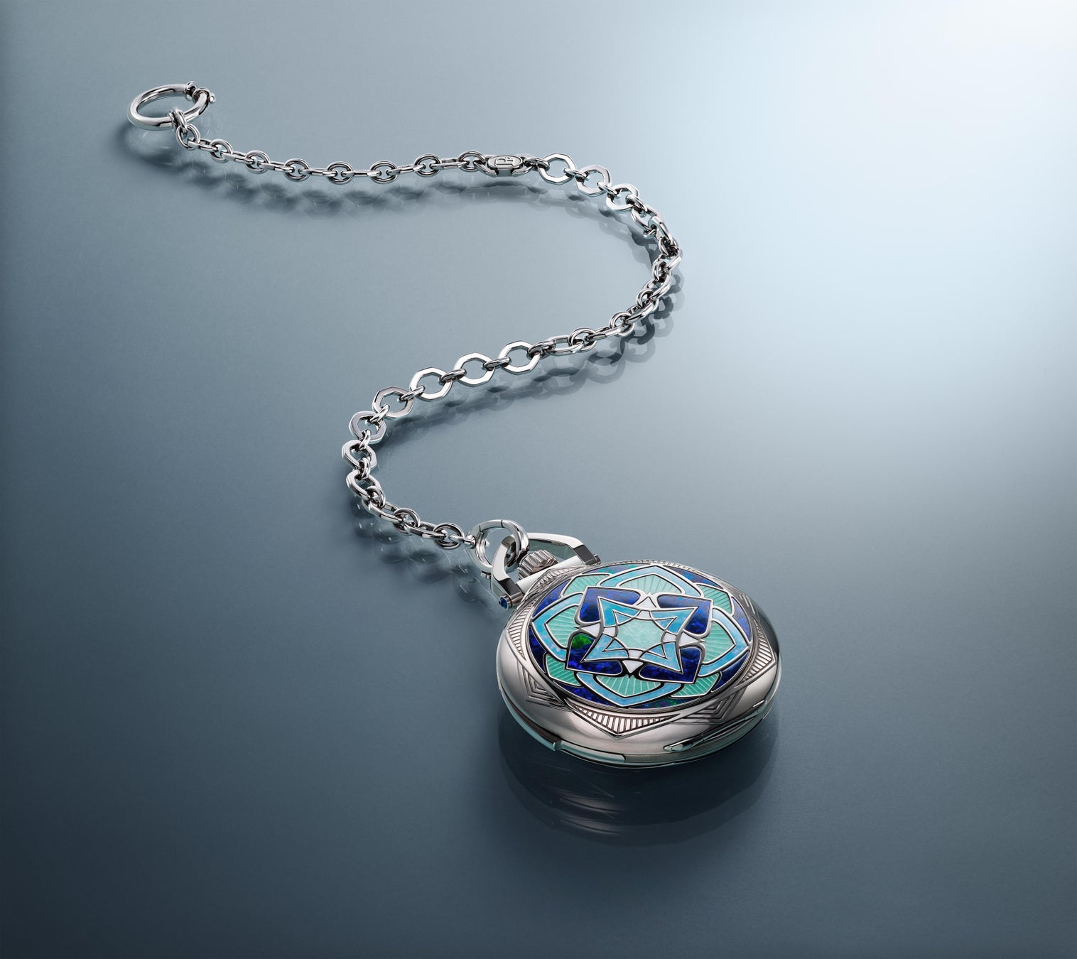 ホワイトゴールド製のケースから、オパールと翡翠のマルケトリーで飾られた二重の裏蓋。