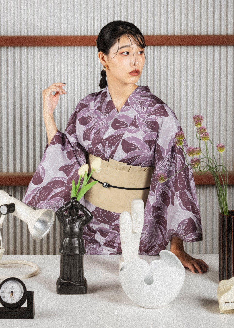 トレンドのパープルにダマスク柄の帯を合わせてリッチな大人クラシカルスタイル。
