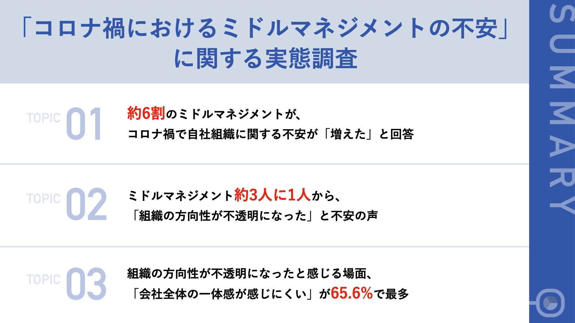 ミドルマネジメントの約6割がコロナ禍で自社組織に関する不安「増えた」と回答 約3人に1人が「組織の方向性が不透明になった」の声