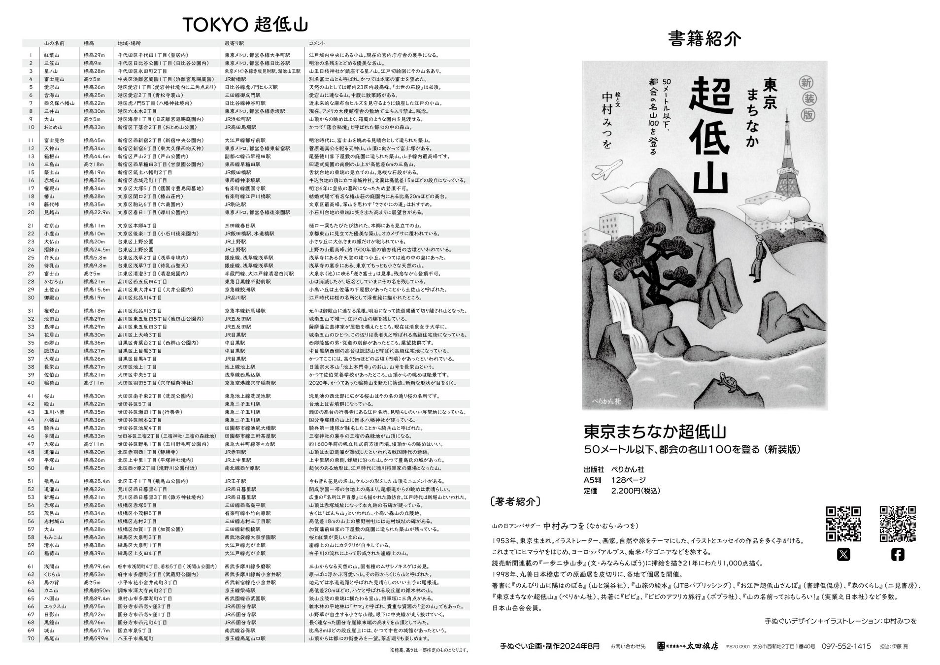 それぞれ山の名前・高さ・地域・最寄り駅・コメントをまとめたグラフ付き、さらに裏面にはデザイン・イラストレーションを担当した中村みつを氏の各代表山のイラスト付きです。