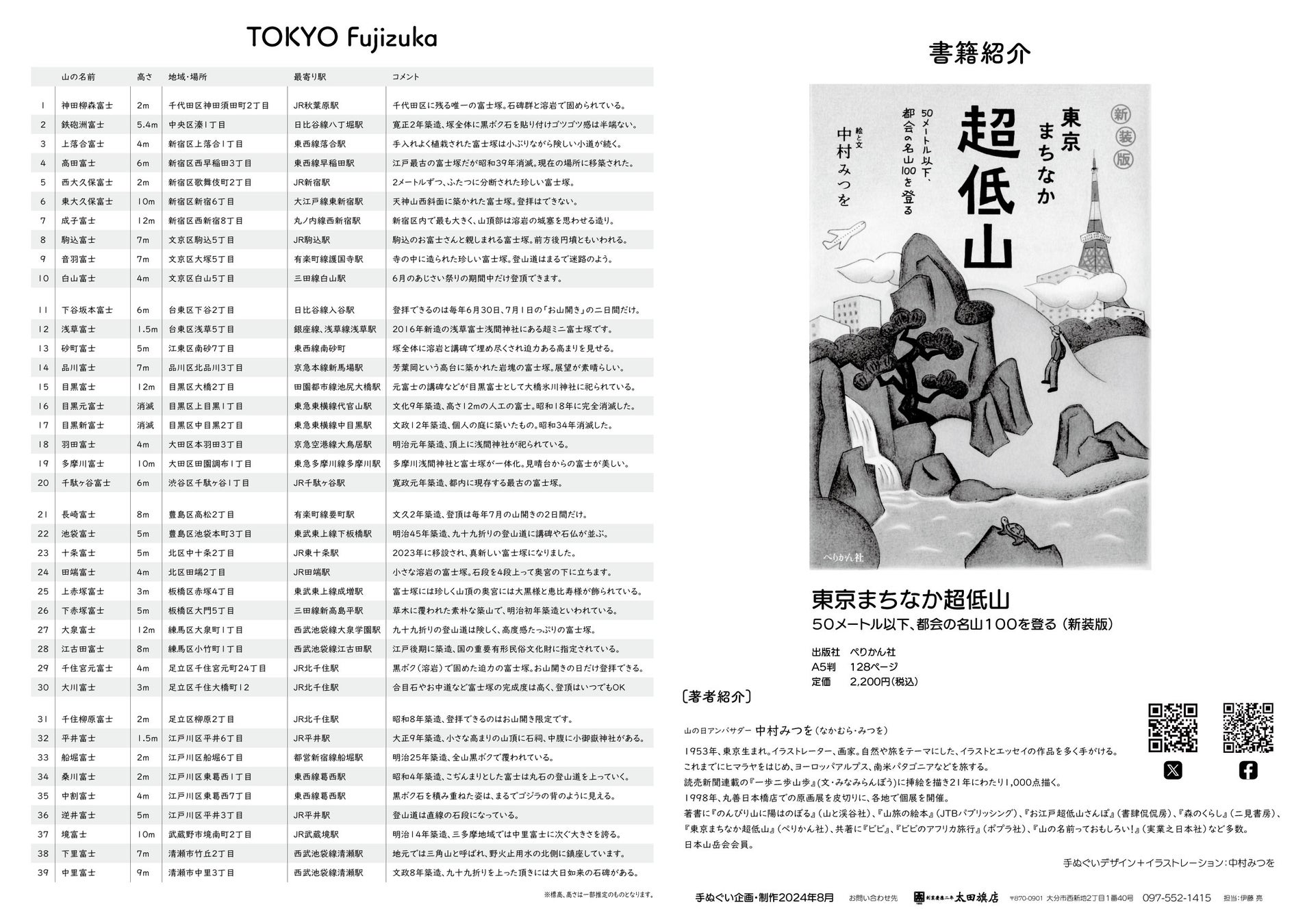 創業慶応二年太田旗店×山の日アンバサダー中村みつを氏のコラボレーションにより、東京に特化した「超低山」「Fujizuka」を描いた手ぬぐいが誕生。「山の日」全国大会TOKYO2024にて販売決定!