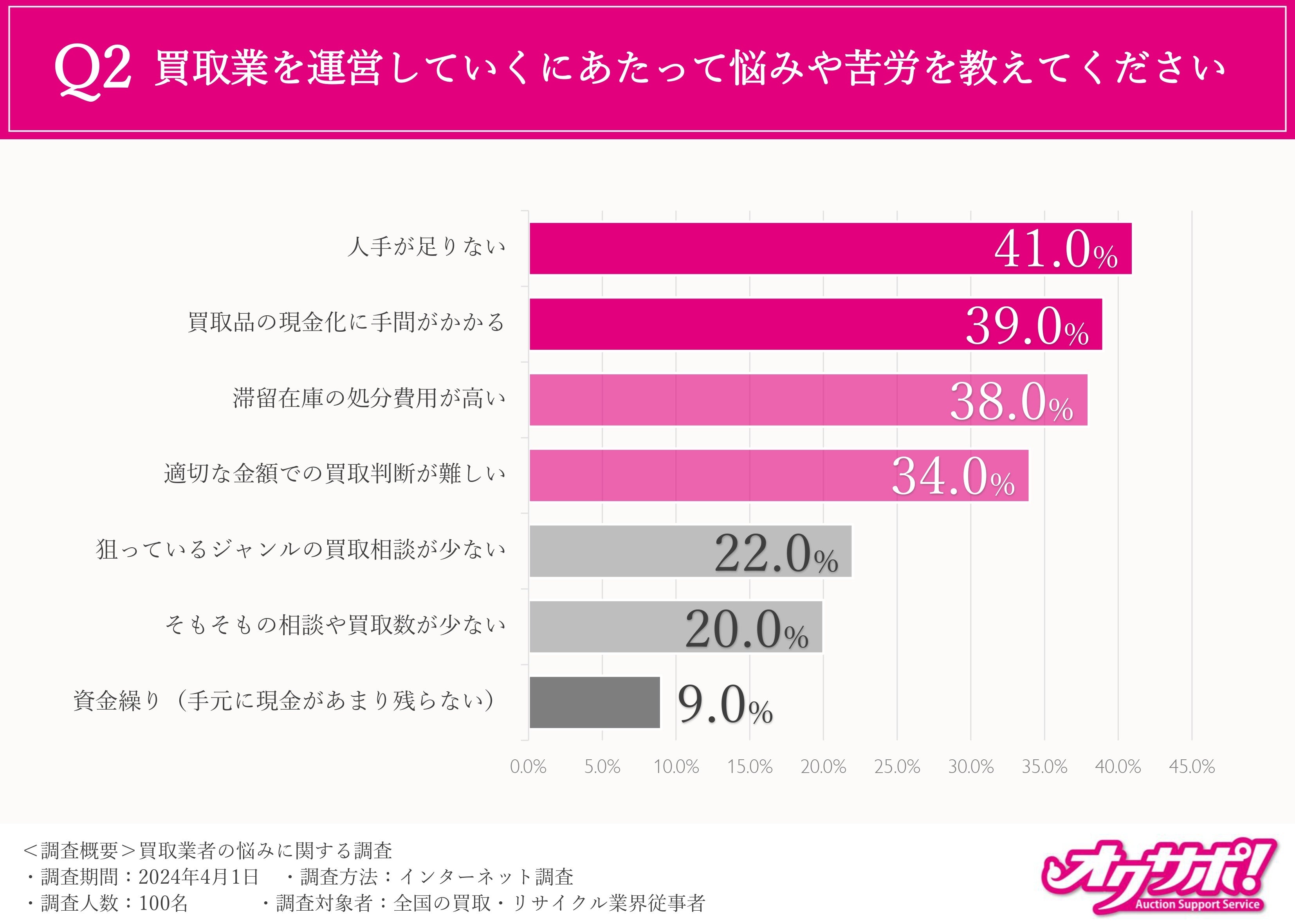 そこで、買取業を運営していくにあたって悩みや苦労を伺ったところ、「人手が足りない(41.0%)」「買取品の現金化に手間がかかる(39.0%)」「滞留在庫の処分費用が高い(38.0%)」「適切な金額での買取判断が難しい(34.0%)」という回答が集まりました。