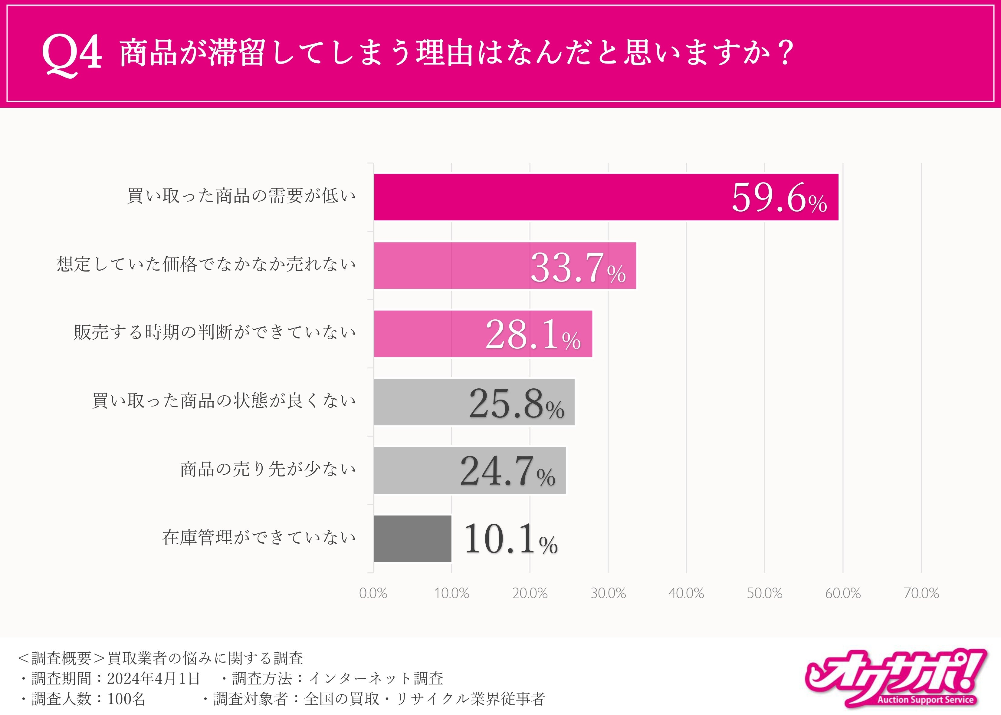 伺ってみたところ、「買い取った商品の需要が低い(59.6%)」「想定していた価格でなかなか売れない(33.7%)」という回答が集まりました。