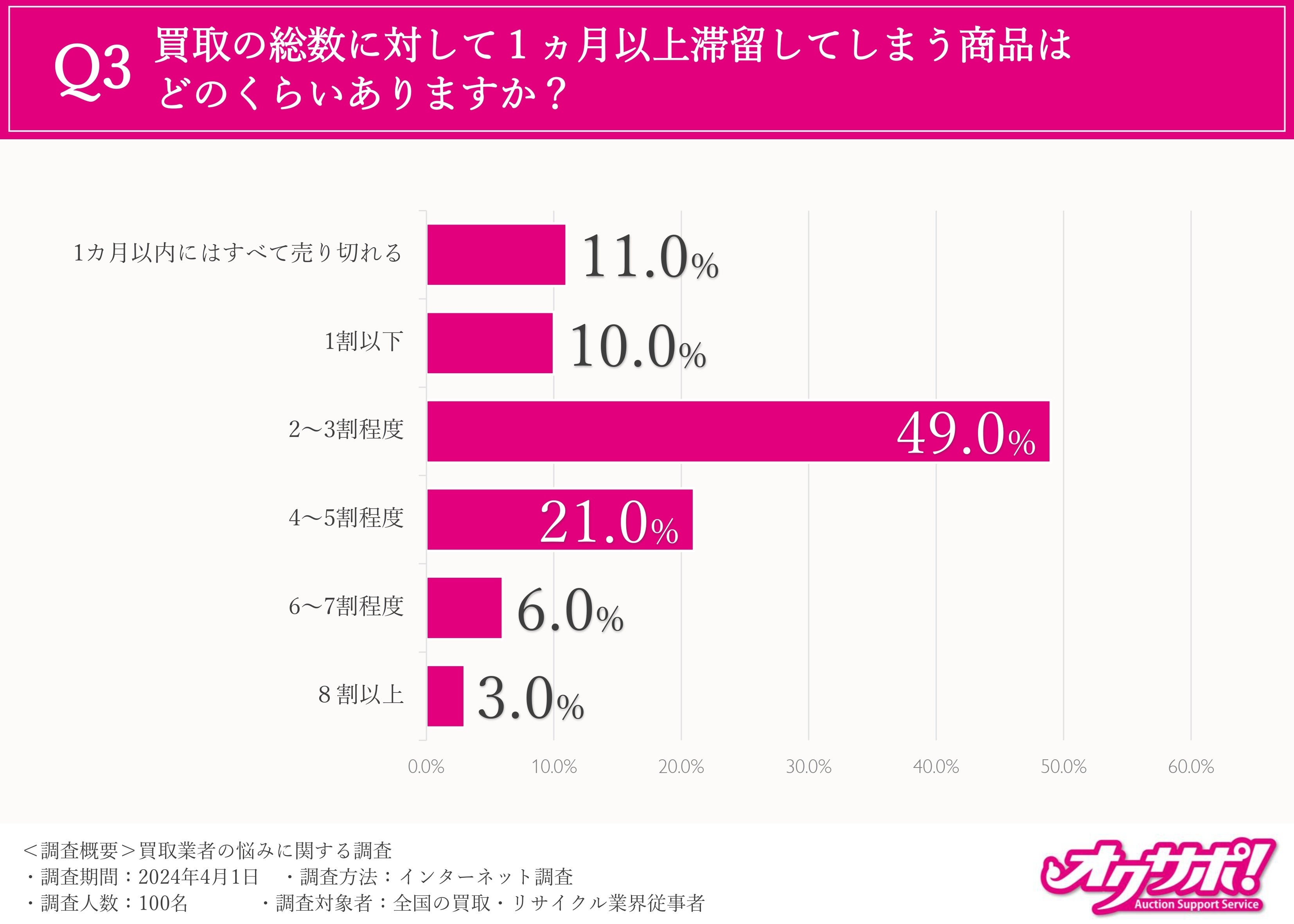 まず、買取の総数に対して1ヵ月以上滞留してしまう商品はどのくらいあるのか伺ったところ、「2〜3割程度(49.0%)」という回答が最も多く見られました。