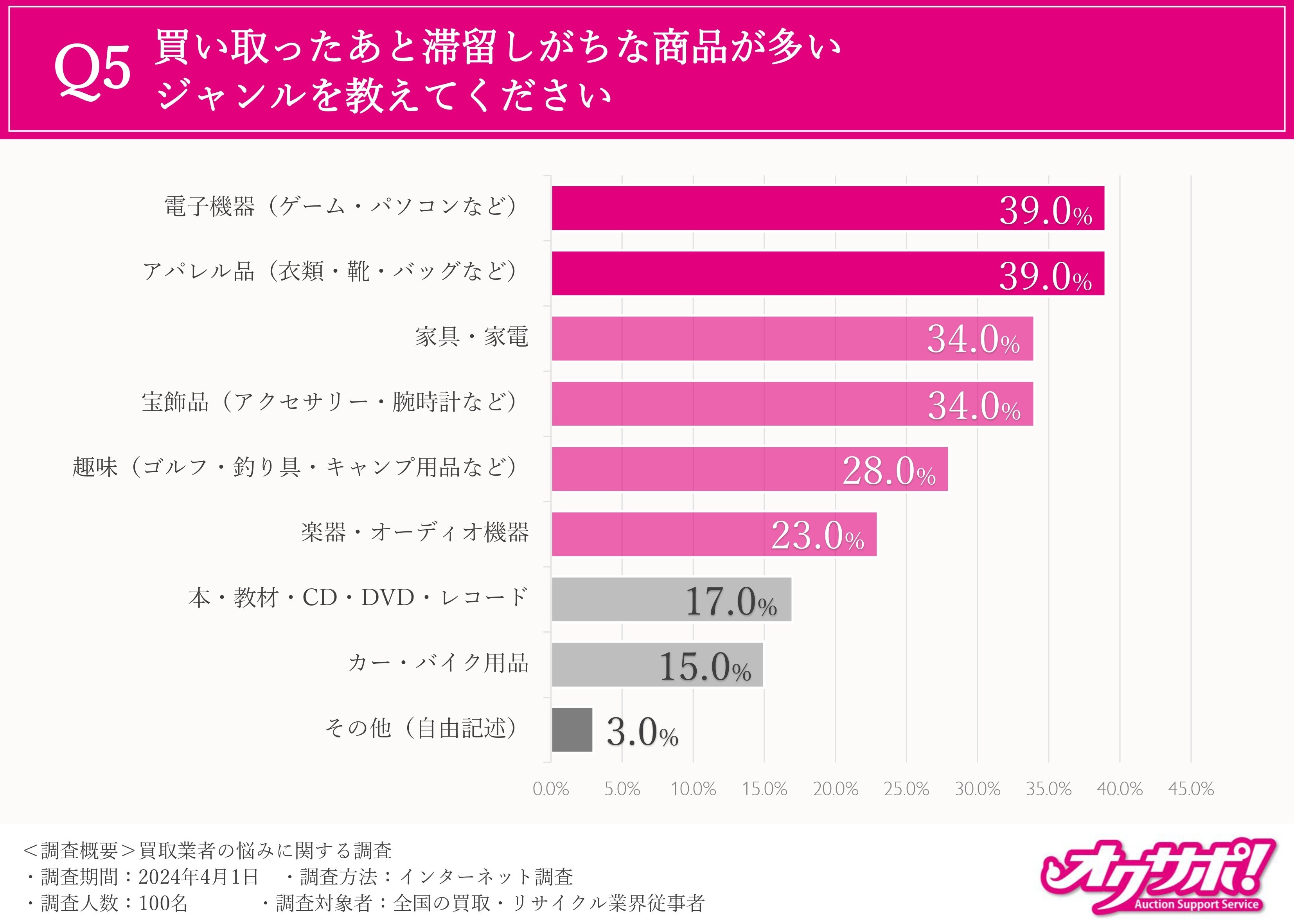 買い取ったあと滞留しがちな商品が多いジャンルについて伺ったところ、「電子機器(ゲーム・パソコンなど)(39.0%)」「アパレル品(衣類・靴・バッグなど)(39.0%)」「家具・家電(34.0%)」「宝飾品(アクセサリー・腕時計など)(34.0%)」という回答が集まりました。