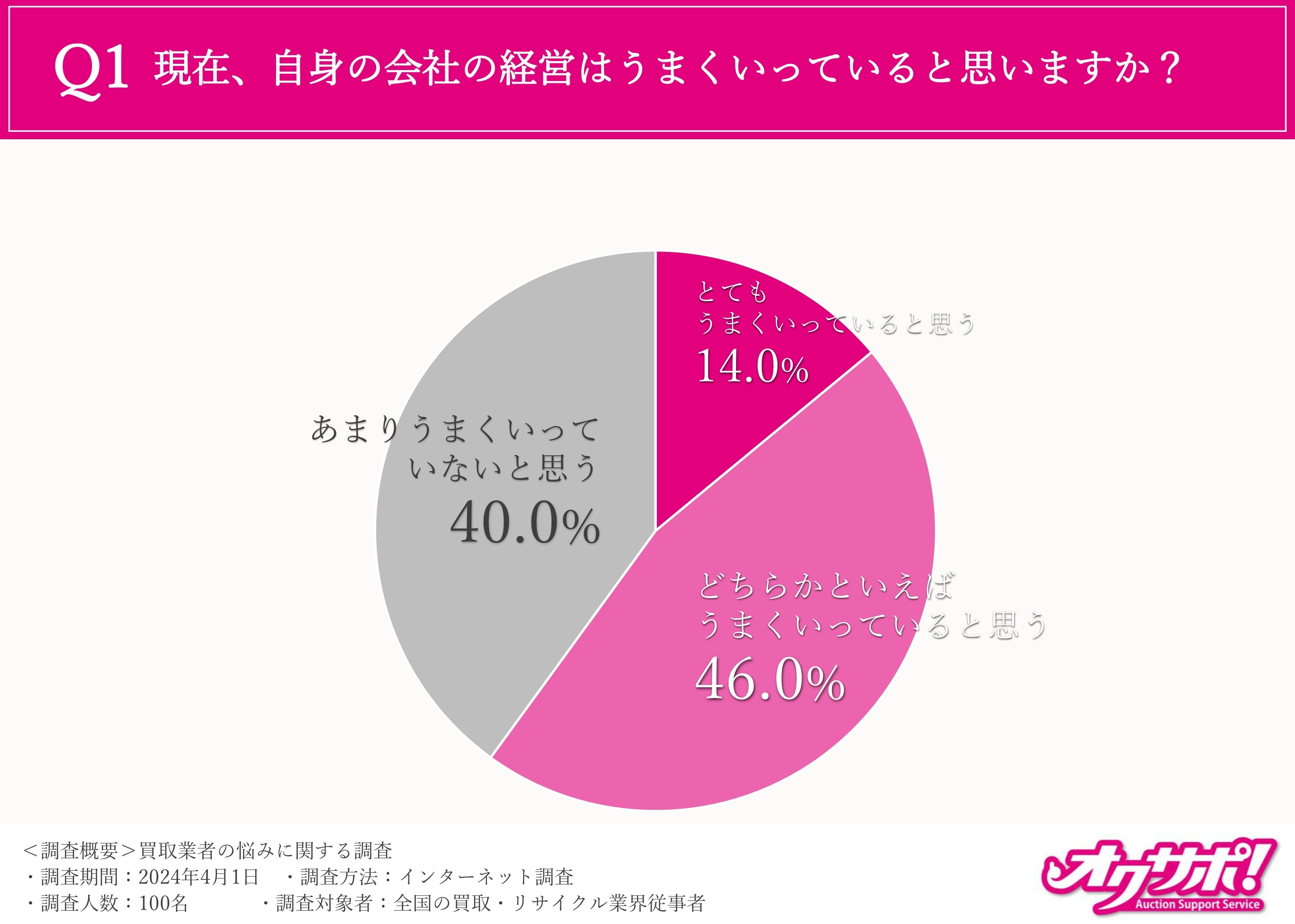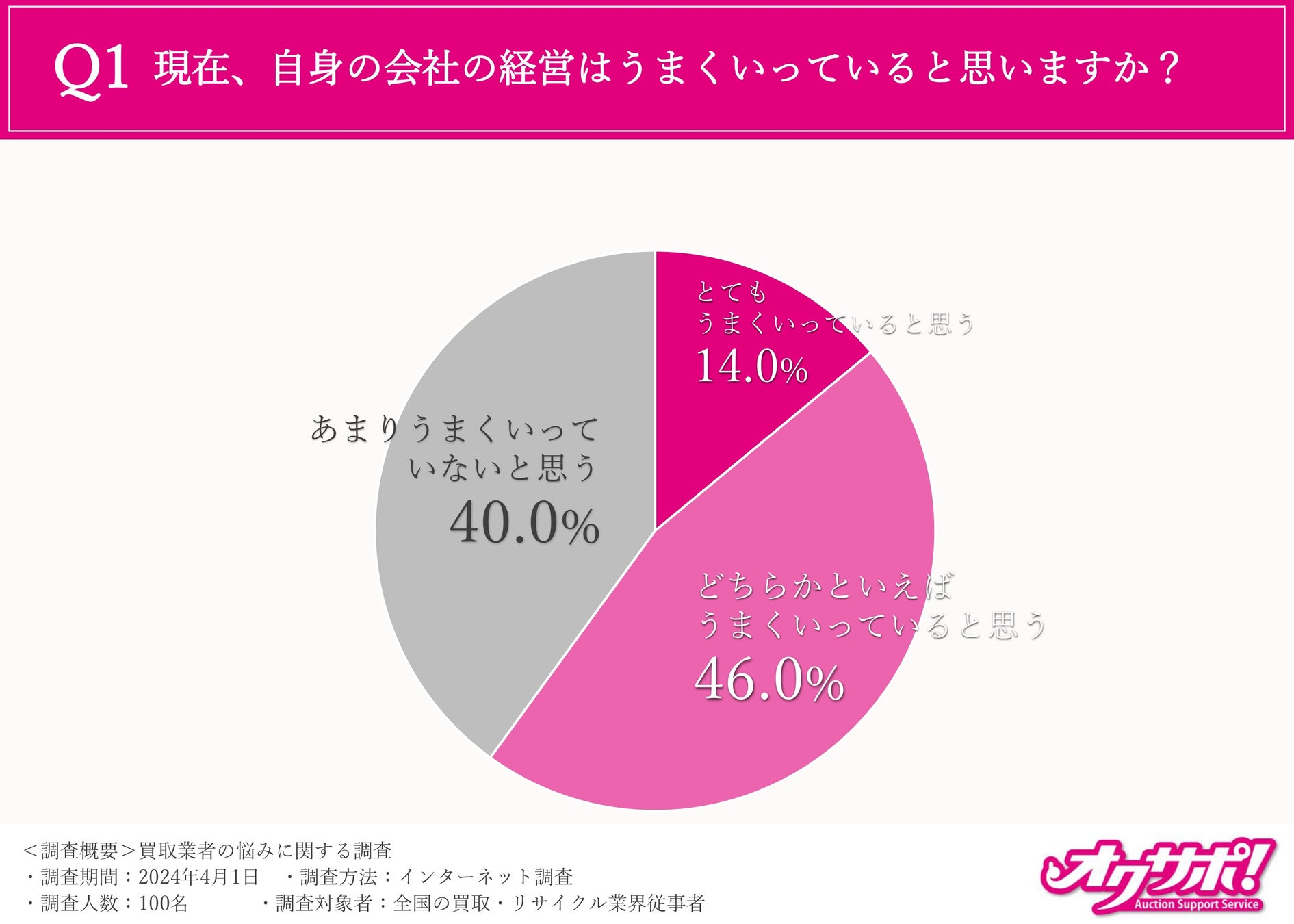 はじめに、現在、自身の会社の経営はうまくいっていると思うか伺ったところ、「あまりうまくいっていないと思う(40.0%)」「どちらかといえばうまくいっていると思う(46.0%)」「とてもうまくいっていると思う(14.0%)」という回答が集まりました。