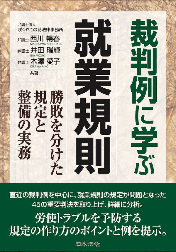全国約650社の顧問先(2026年3月現在)の実績があり、労働問題や人事労務を中心とした企業法務に特化した法律事務所として「企業法務の法律相談サービス」や、お役立ち情報Webメディア「咲くや企業法務.NET」、チャンネル登録数2.9万人の「公式YouTubeチャンネル」などを運営する、弁護士法人 咲くやこの花法律事務所(所在地:大阪市西区)の代表弁護士 西川暢春/弁護士 井⽥ 瑞輝/弁護士 ⽊澤 愛⼦が、新刊書籍『裁判例に学ぶ就業規則ー勝敗を分けた規定と整備の実務』(出版社:株式会社日本法令)を2026年3月25日に発売しました。