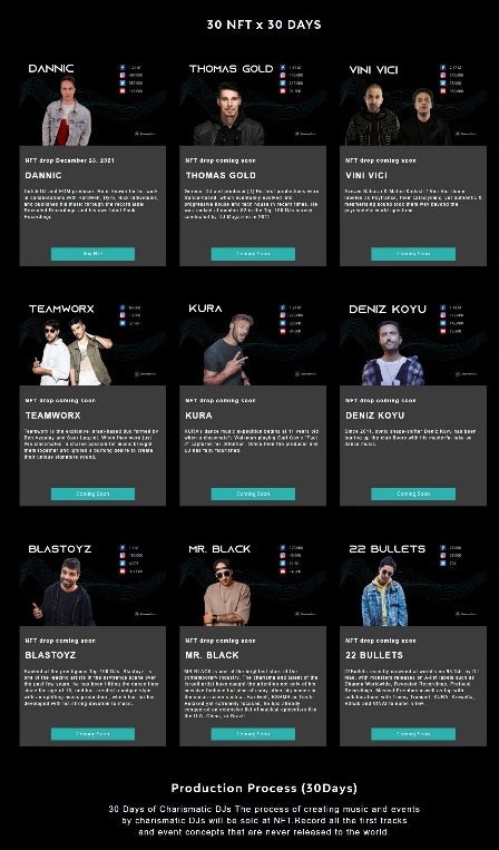 NFTコンテンツ開発においてはクラブミュージック専門メディアであるイスラエル・WeRaveYou社と事業提携を行い、世界のTop DJの参加を促進します。すでに9名のTop DJが参加しており、各DJの新曲制作30日間の過程を記録し、その1日分をNFT化して販売する『Production Process 30Days』はDJ達の協力のもと、世界に類をみない企画となっております。また、DJをアバター化し、アバターにギフトを贈るサービスも開始されます。