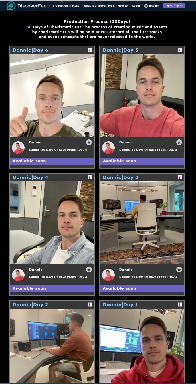 世界TOPランカーDJの新曲の制作過程を30日間記録し、制作過程の動画をNFT化して販売するサービス