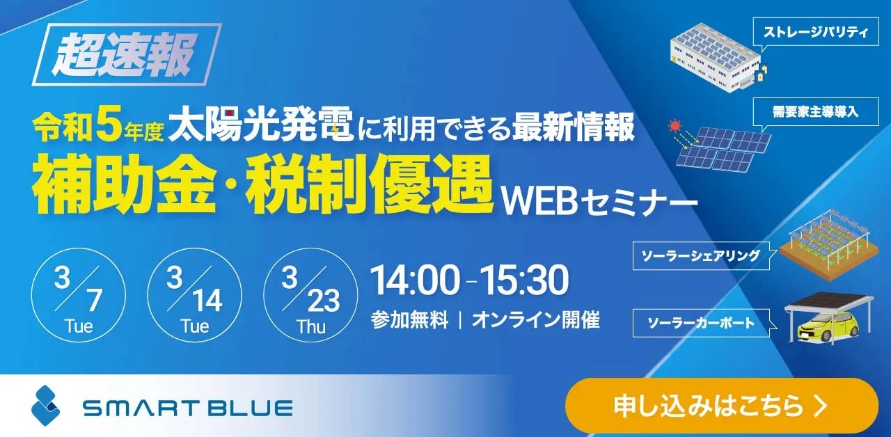 スマートブルー、令和5年度最新の補助金・税制優遇情報を紹介する企業向け太陽光発電WEBセミナーを開催