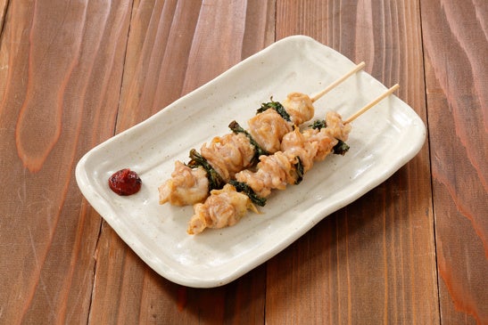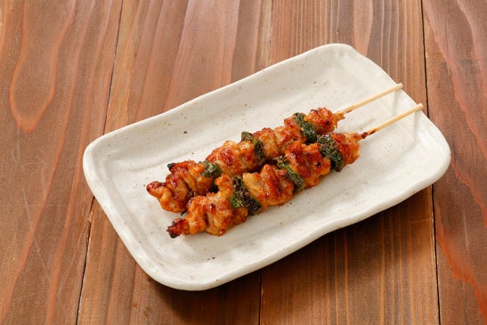 鶏ハラミの間に刺した大葉の爽やかさに加え、梅肉を付ける事で更にサッパリさが増しクセになる味です。