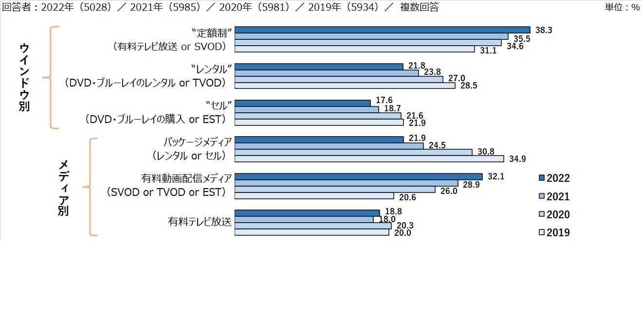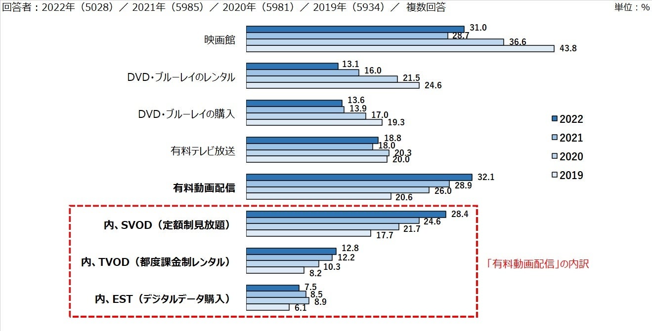 映画館はやや回復、DVD・ブルーレイのレンタルは3年で11.5ポイント減、有料動画配信は32.1%