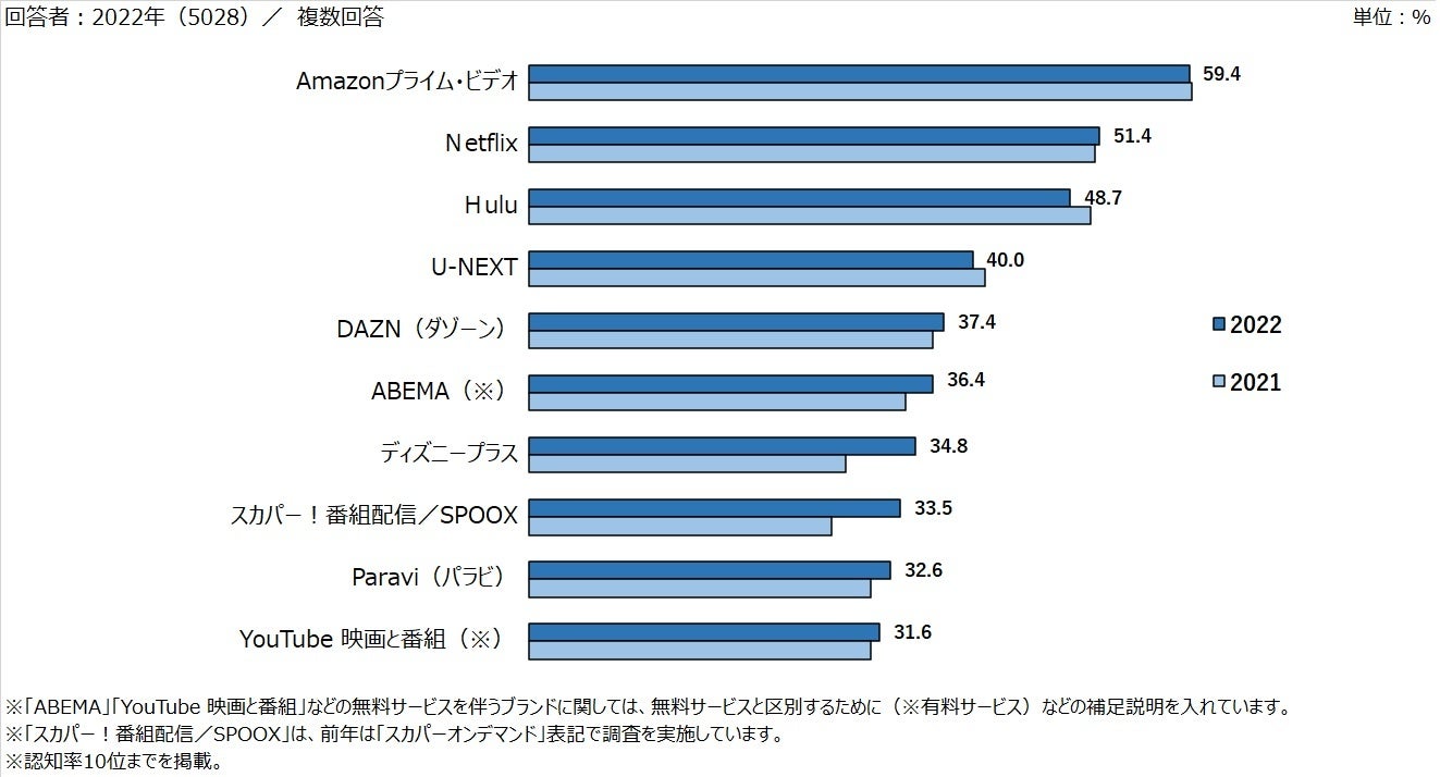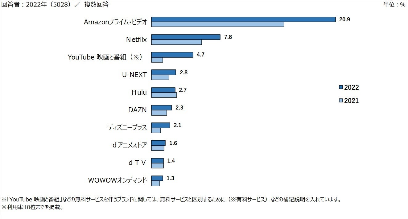 「Amazonプライム・ビデオ」が前年から5.8ポイント増加し、2割に到達