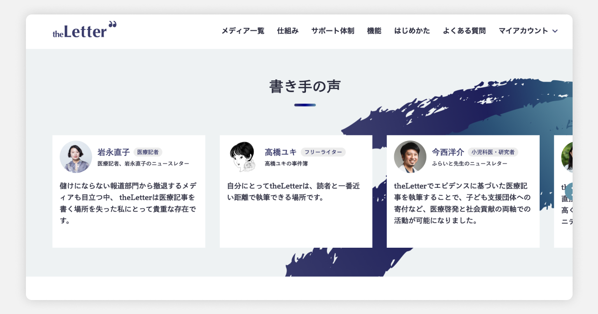 「読者と一番近い距離で執筆できる場所」「書き手をサポートしようというコンセプトがぶれない」「theLetterは医療記事を書く場所を失った私にとって貴重な存在」など、書き手ユーザーの方々からコメント多くいただいております。