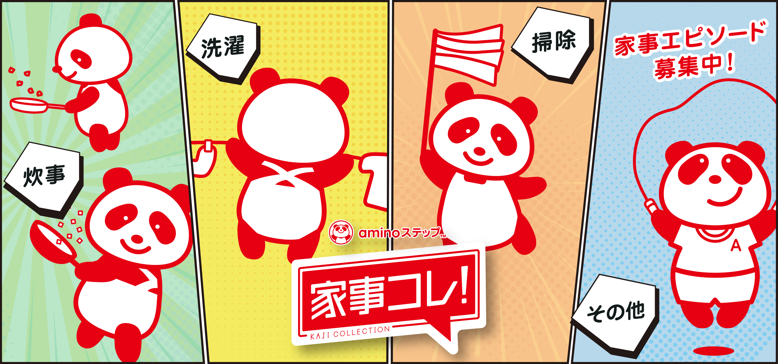 「aminoステップ」公式Twitterアカウント(@aminostep https://twitter.com/aminostep)を通じて「掃除」「洗濯」「炊事」「その他」それぞれの部門の家事に関するエピソードを募集します。