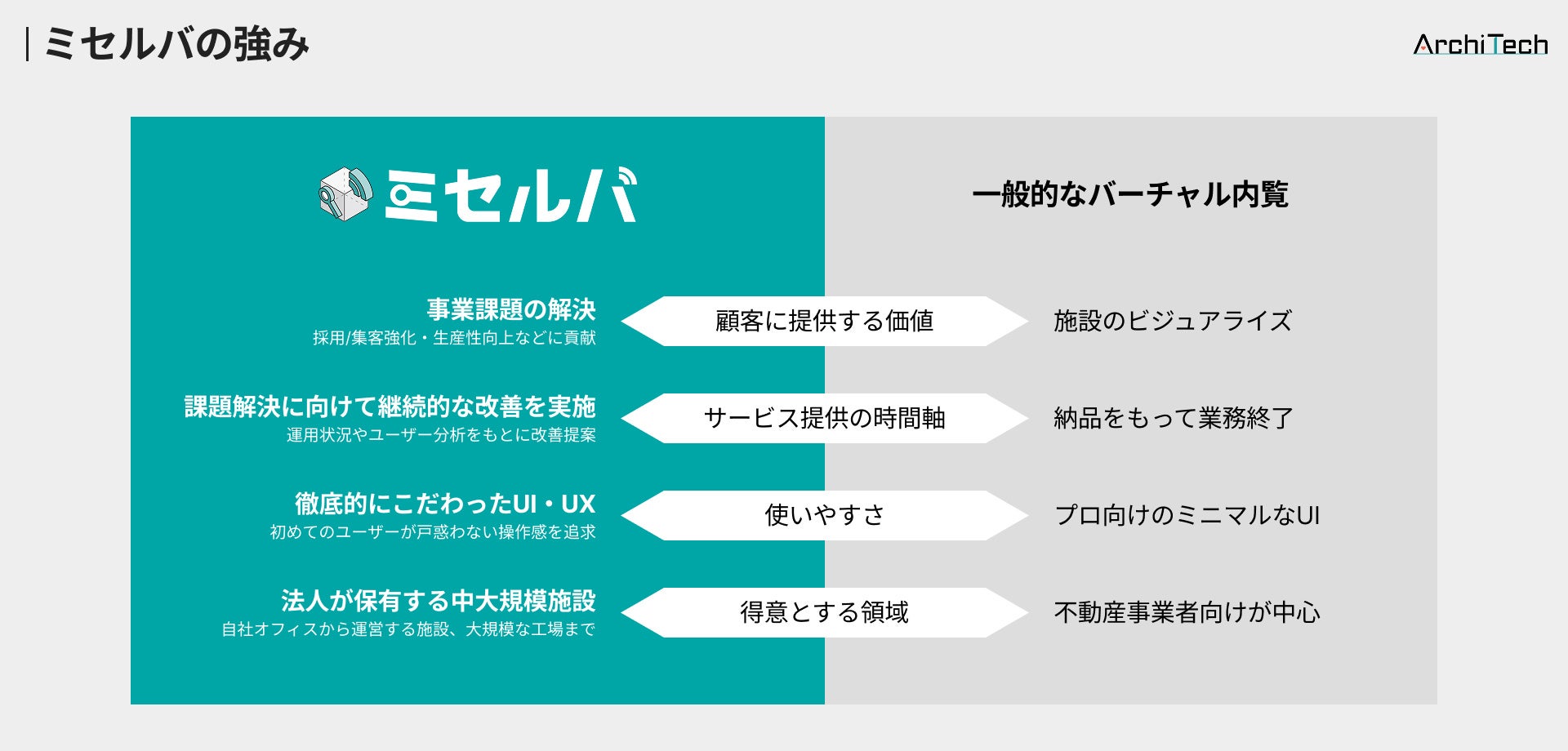 ArchiTech株式会社では「人々に愛される建築が持続的に生まれる社会を実現する」というビジョンの実現に向けて、今後もミセルバのサービス改善を続けてまいります。