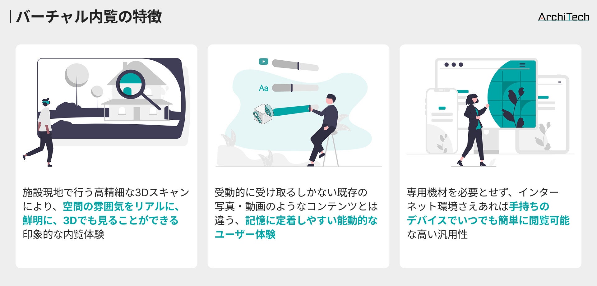本サービスの特徴は、バーチャル内覧のプロフェッショナルである"バーチャルアーキテクト"がお客様とともに撮影計画から情報設計、納品後の継続的な改善まで伴走する点にあり、視覚情報のみに留まらず、施設の価値も含めて「魅せる」ことにこだわっています。