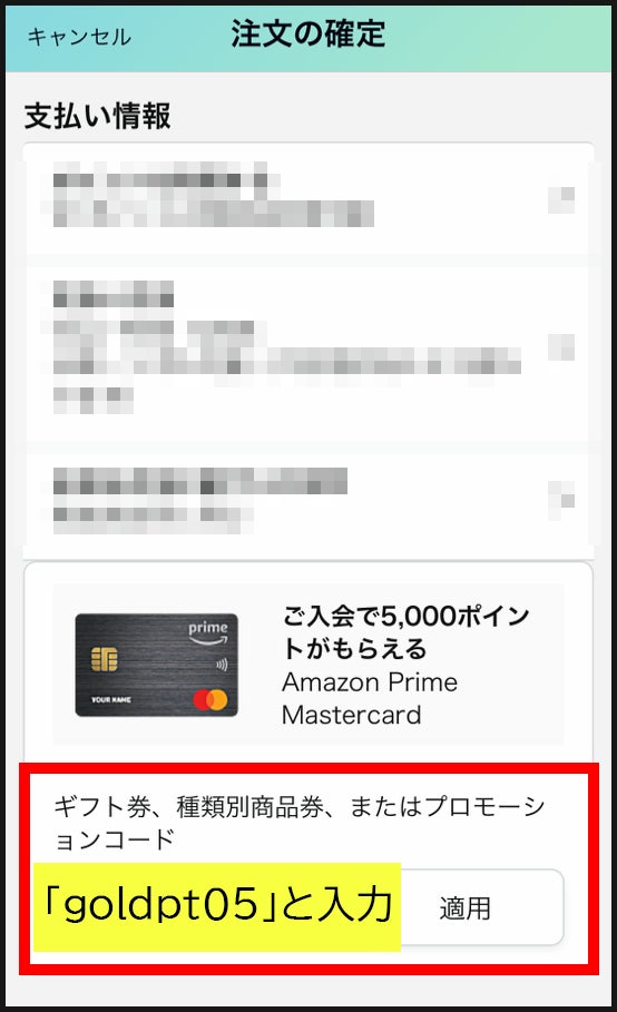 下の画像のようにAmazon注文確定時にプロモーションコード【goldpt05】と入力すると【1000円OFF】が適用される。
