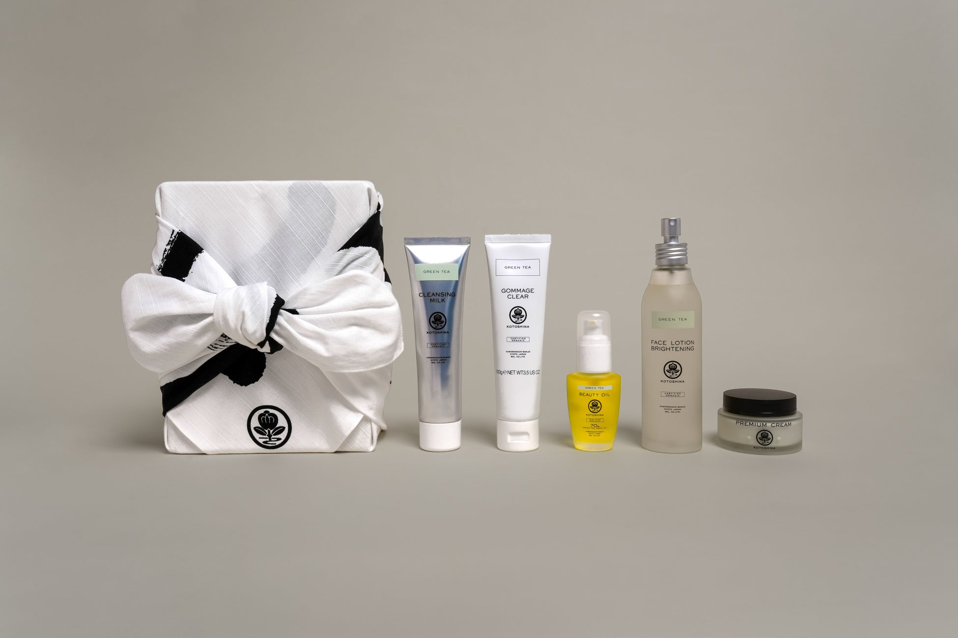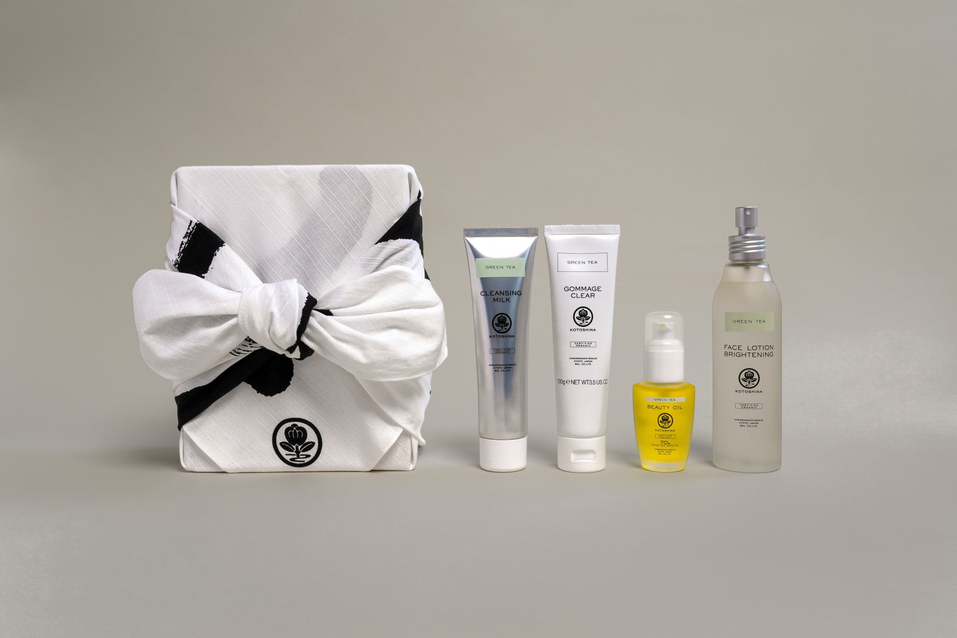 KOTOSHINAのキー成分「茶の実(グリーンティーシード)」から抽出されたオイルを贅沢に配合し、根強い人気を誇る「美容オイル」他、多くの人に体験してほしいと語る「クレンジングミルク」と「ローションホワイト」、「ゴマージュクリア」のヒーローアイテム4品がセットになりました。