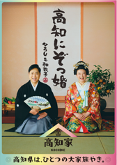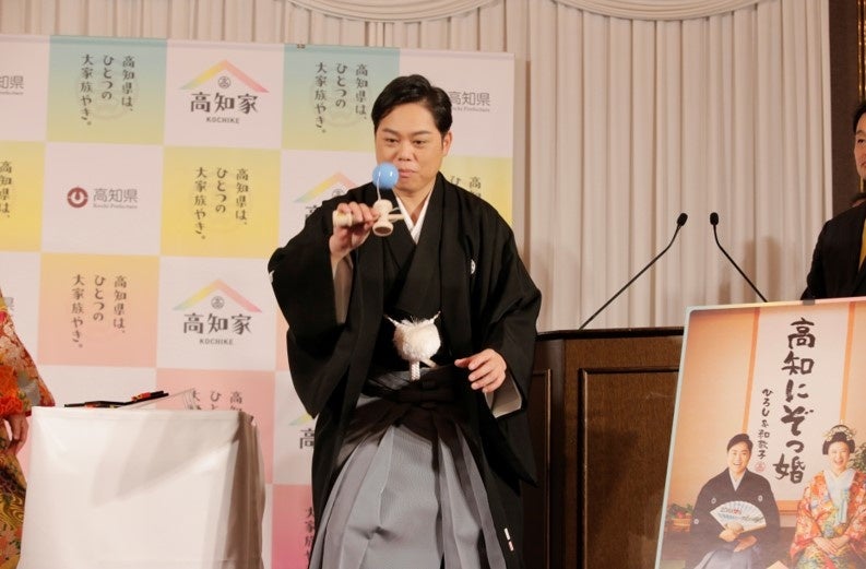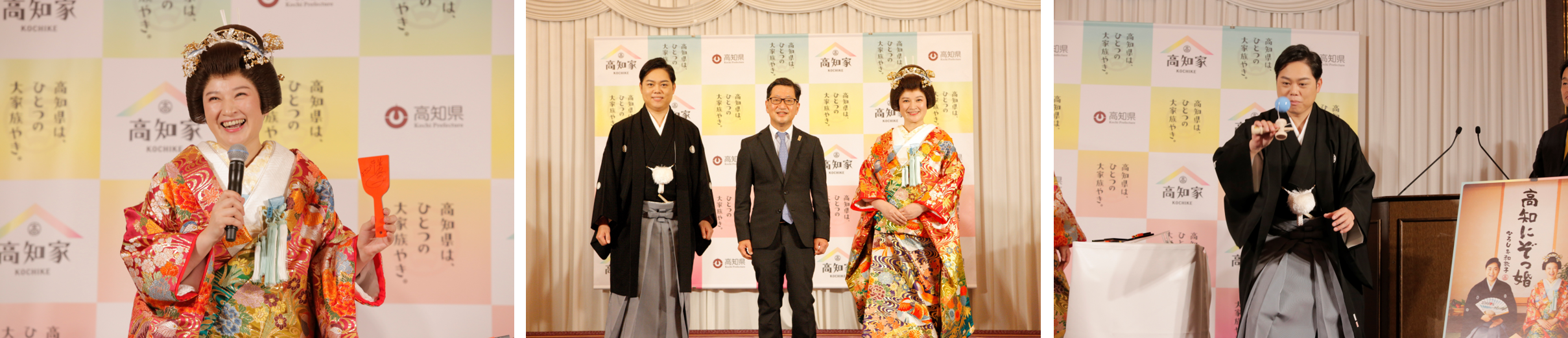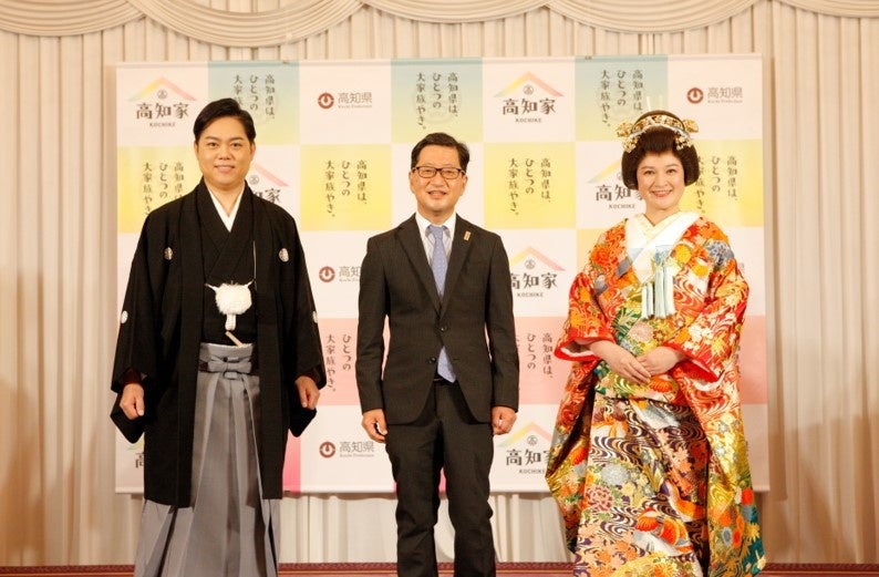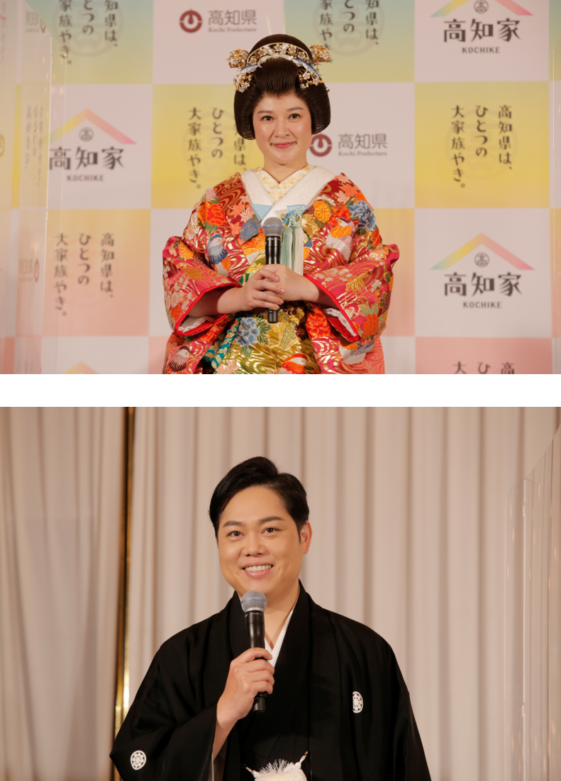 本発表会は、「高知家の姉さん」である島崎和歌子さん、「高知家のアニキ」である三山ひろしさんのお二人をゲストにお迎えし、高知家がさらに多くの人を巻き込み「大家族」となることを示す、高知に“ぞっ婚”をテーマに執り行われました。