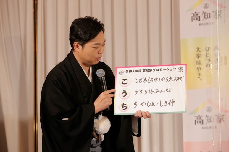 「高知の食」をテーマにした島崎さんは「こ:ここでしか食べられん う:うんとみんな好きな伝統食材というたら ち:チャーテ!」と県民に親しまれる郷土料理を表現。それに続き、 「高知の人」をテーマにした三山さんは「こ:こども(子ども)から大人まで う:うちらはみんな ち:ちか(近)しき仲」と、壁を作らない温かい県民性を熱弁しました。また、「今年度の高知家プロモーションへの成功への想い」をテーマにした濵田知事は「こ:コロナ禍の う:うきめ(憂き目)にめげず ち:ちょうせん(挑戦)そして前進!」と、高知家プロモーションにかける熱い想いを発表しました。