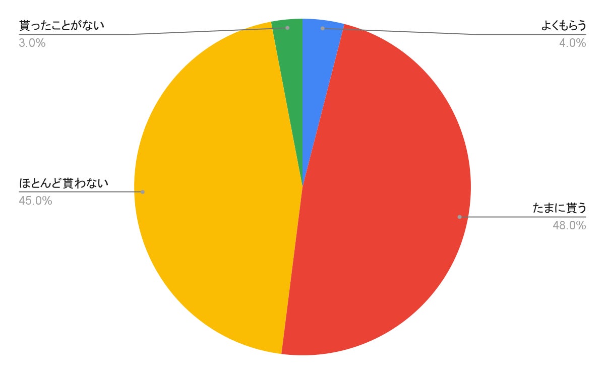 貰ったことがあるが52%、貰ったことがないが48%とほぼ半々ということがわかりました。