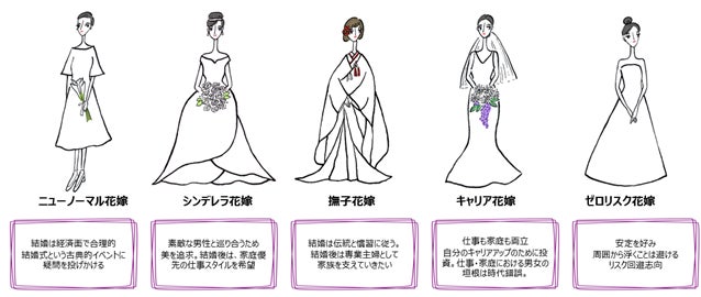 本調査サンプルを対象に生活価値観・結婚意識に関する64項目を用いて因子分析を行い、以下5つの高感度花嫁クラスターを導出。